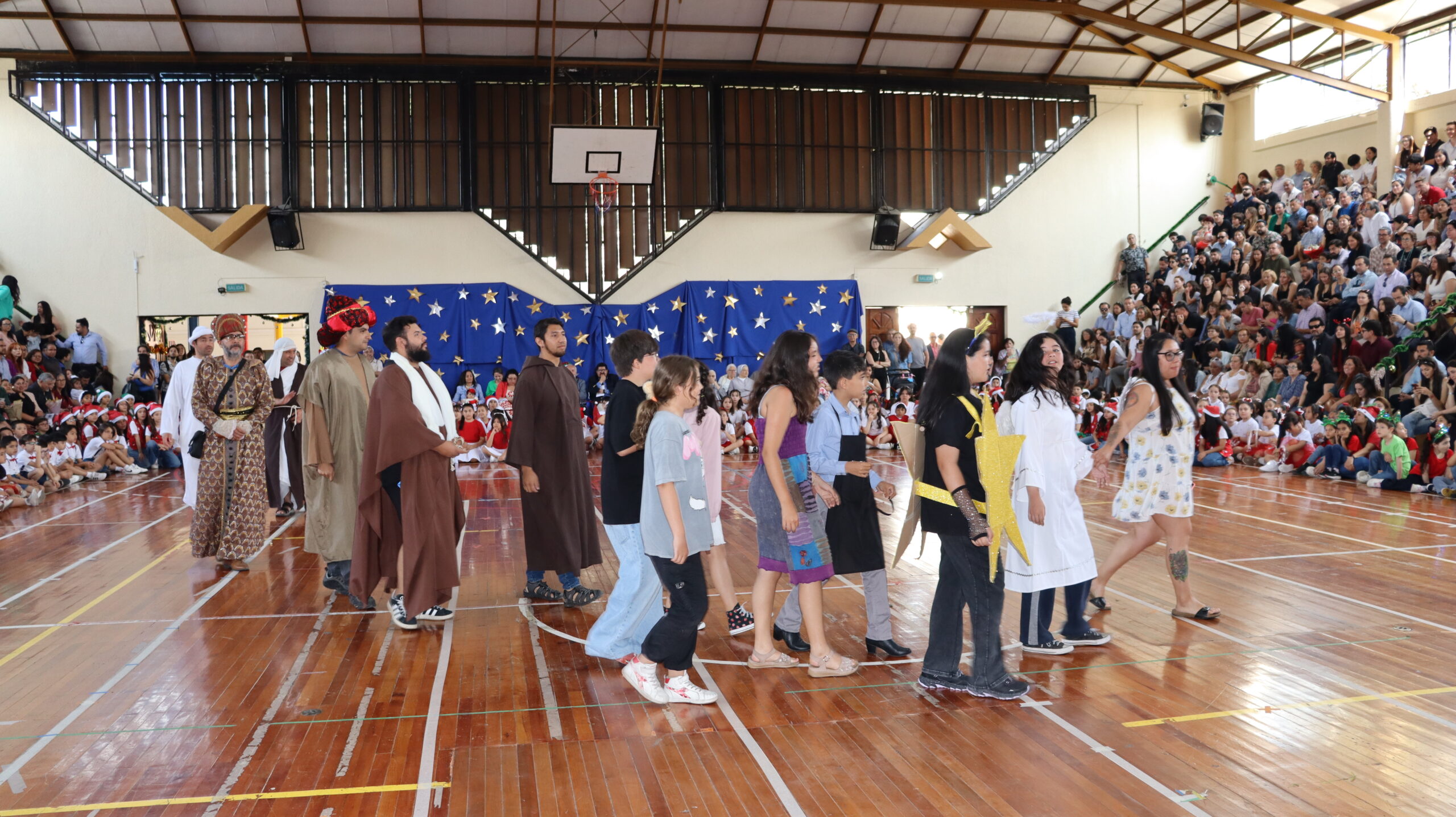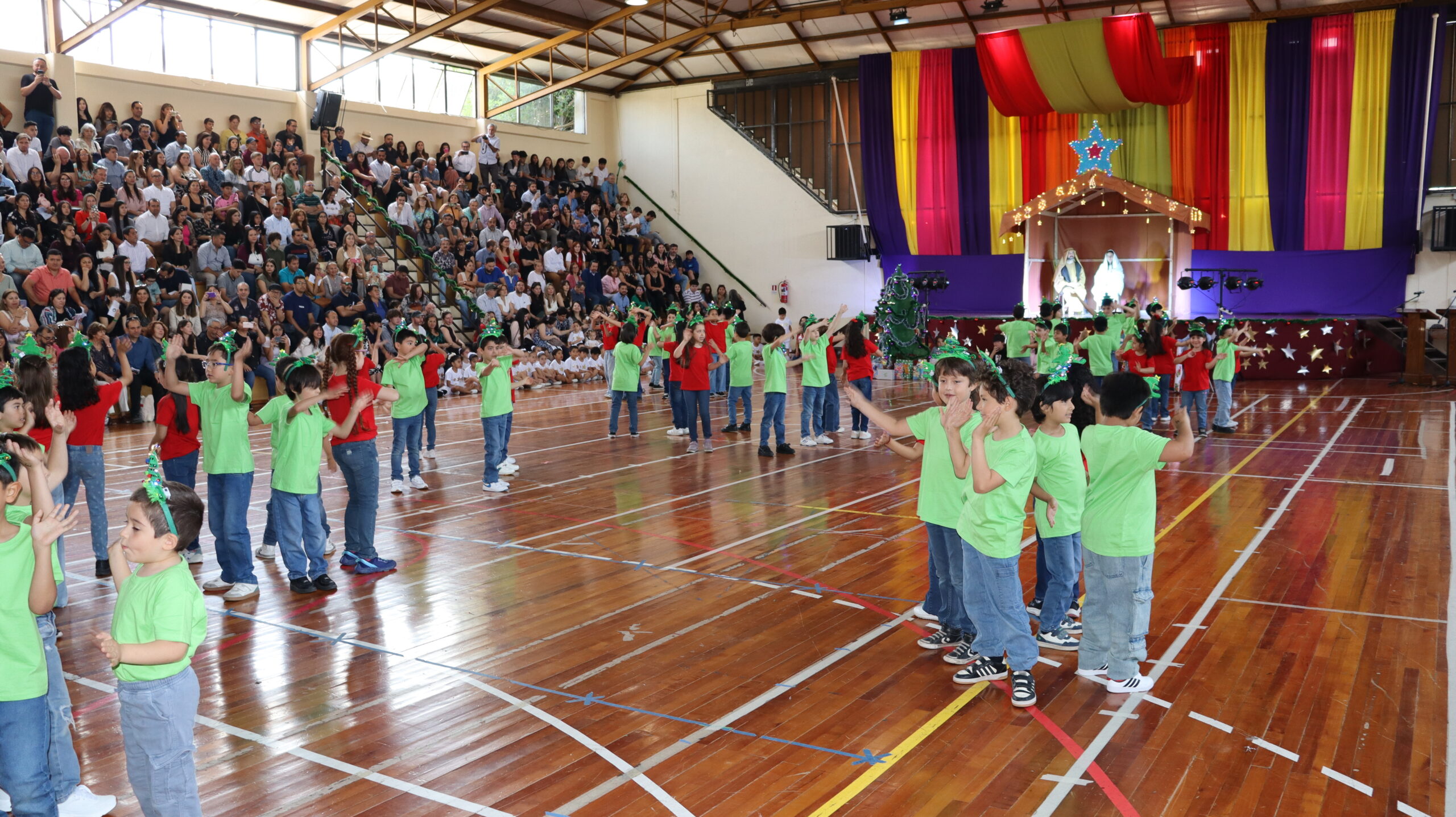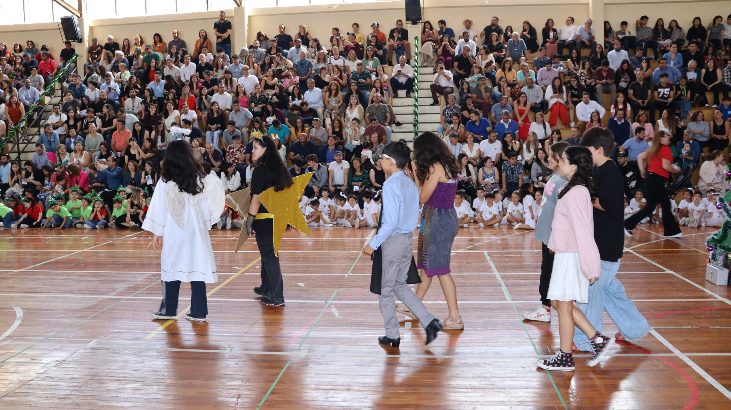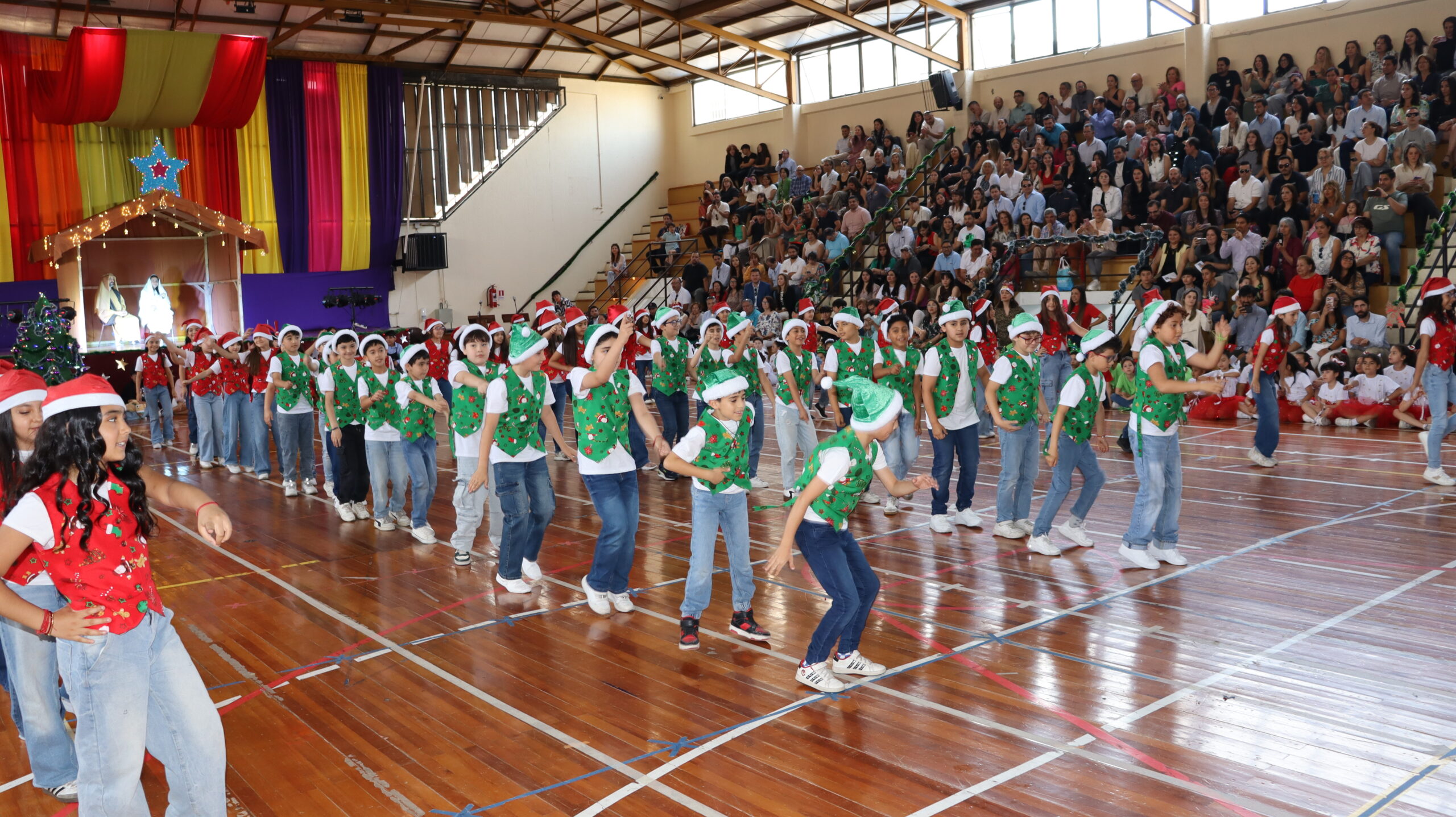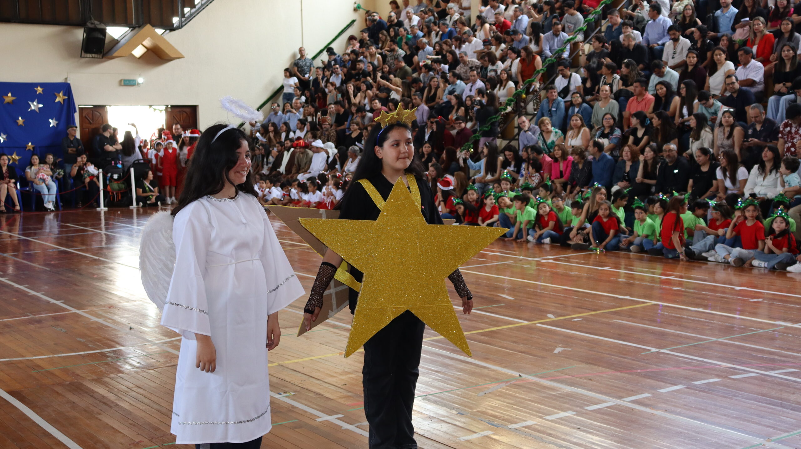 Se presentó la historia llamada “La estrella de Navidad”, donde estudiantes de 5° básico “B” representaron el cuento y apoderados de los cursos que participan en el acto formaron el pesebre humano. Los estudiantes de PK a 4° básicos bailaron diferentes cantos de Navidad, mostrando bellas coreografías armónicas para finalizar todos juntos con la canción “Ya llegó la Navidad.”