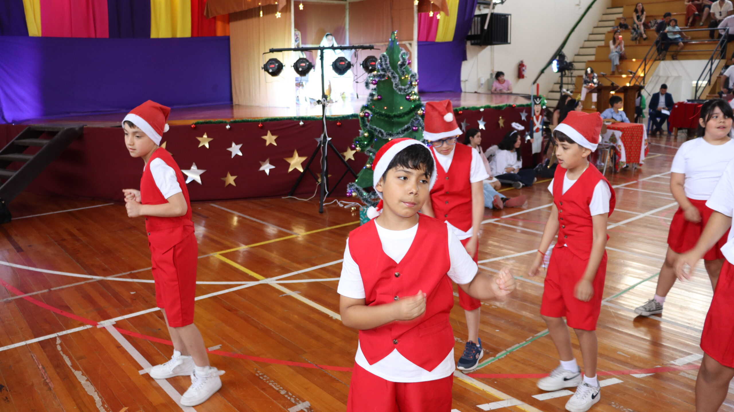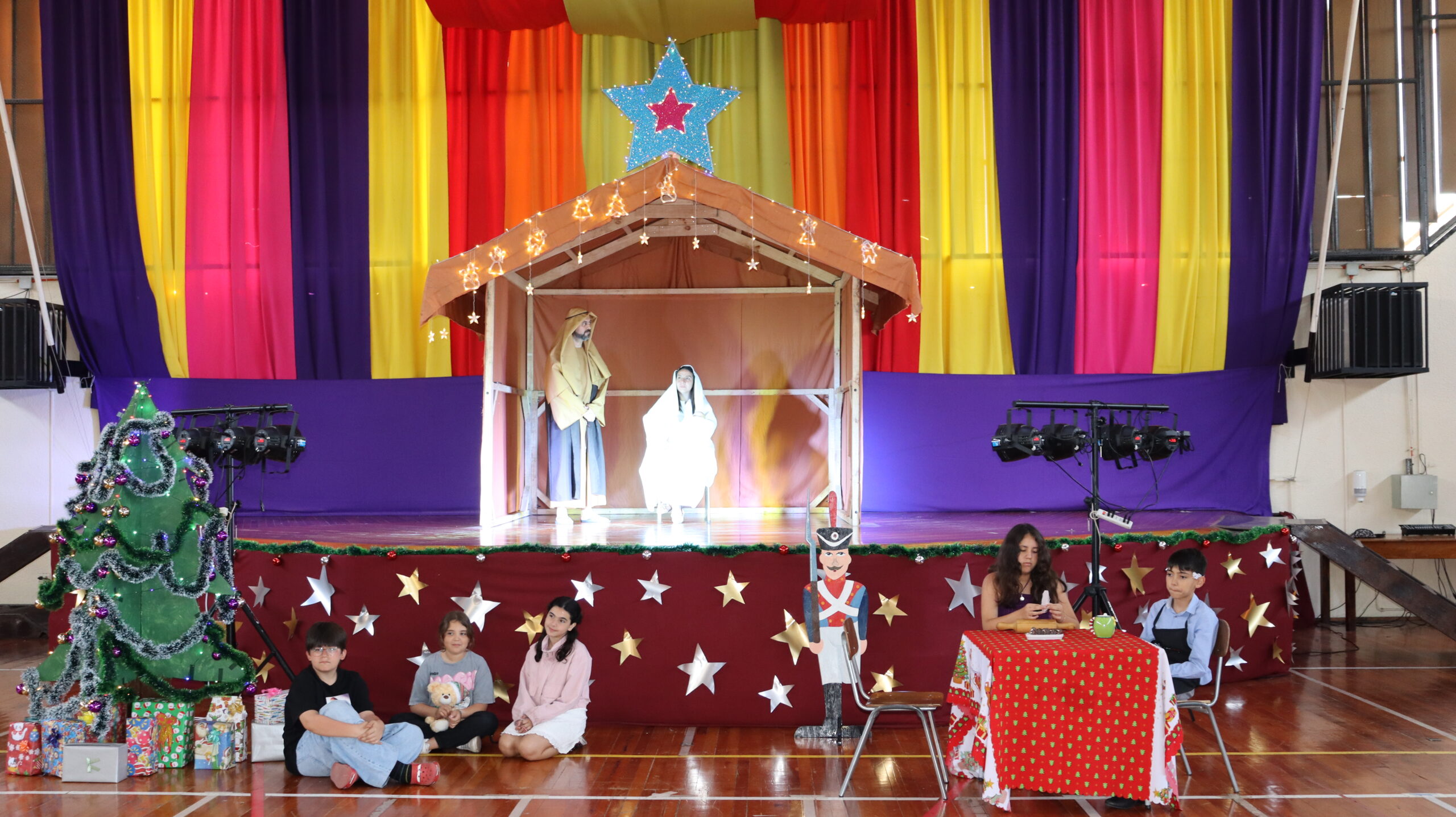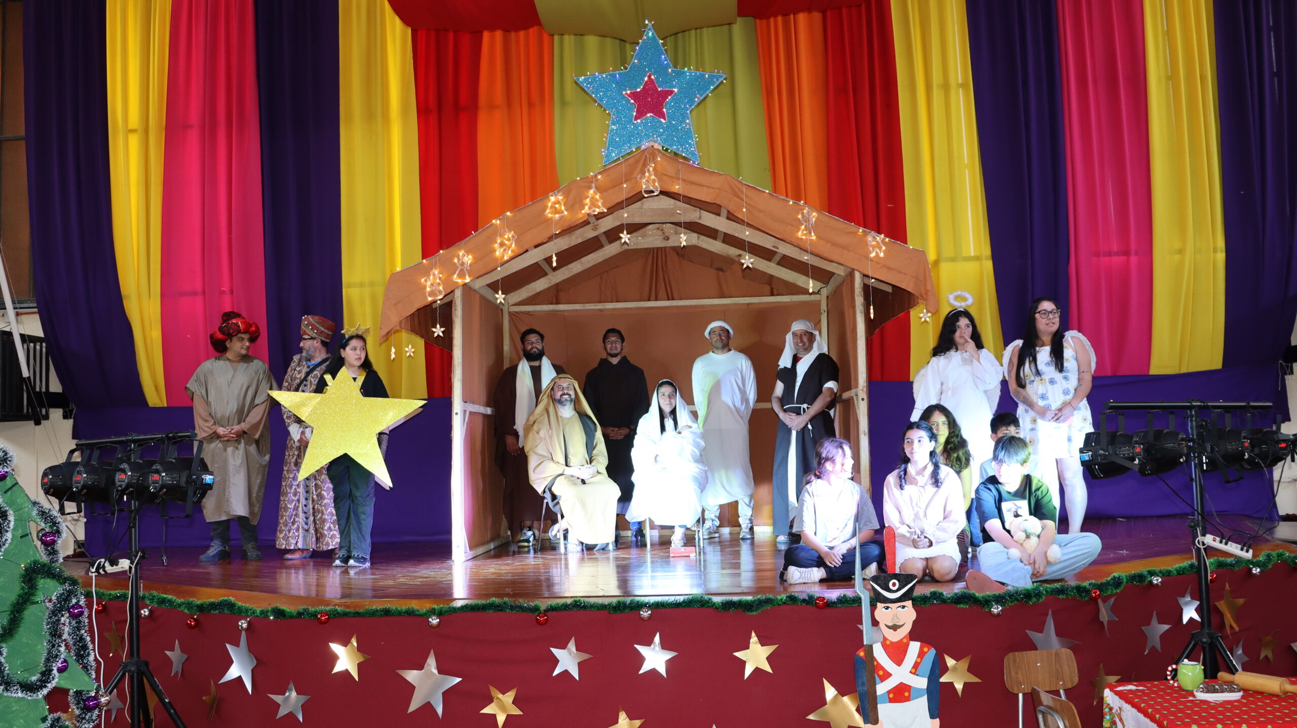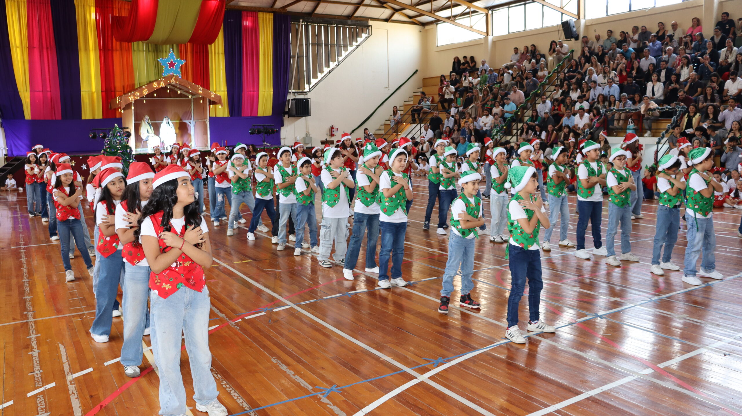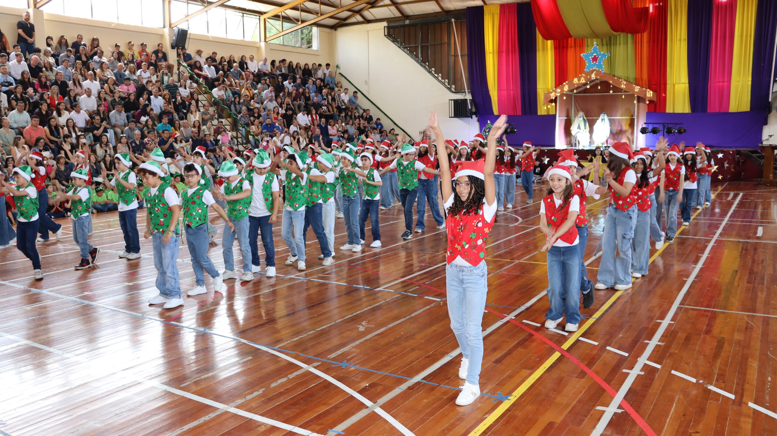 Se presentó la historia llamada “La estrella de Navidad”, donde estudiantes de 5° básico “B” representaron el cuento y apoderados de los cursos que participan en el acto formaron el pesebre humano. Los estudiantes de PK a 4° básicos bailaron diferentes cantos de Navidad, mostrando bellas coreografías armónicas para finalizar todos juntos con la canción “Ya llegó la Navidad.”