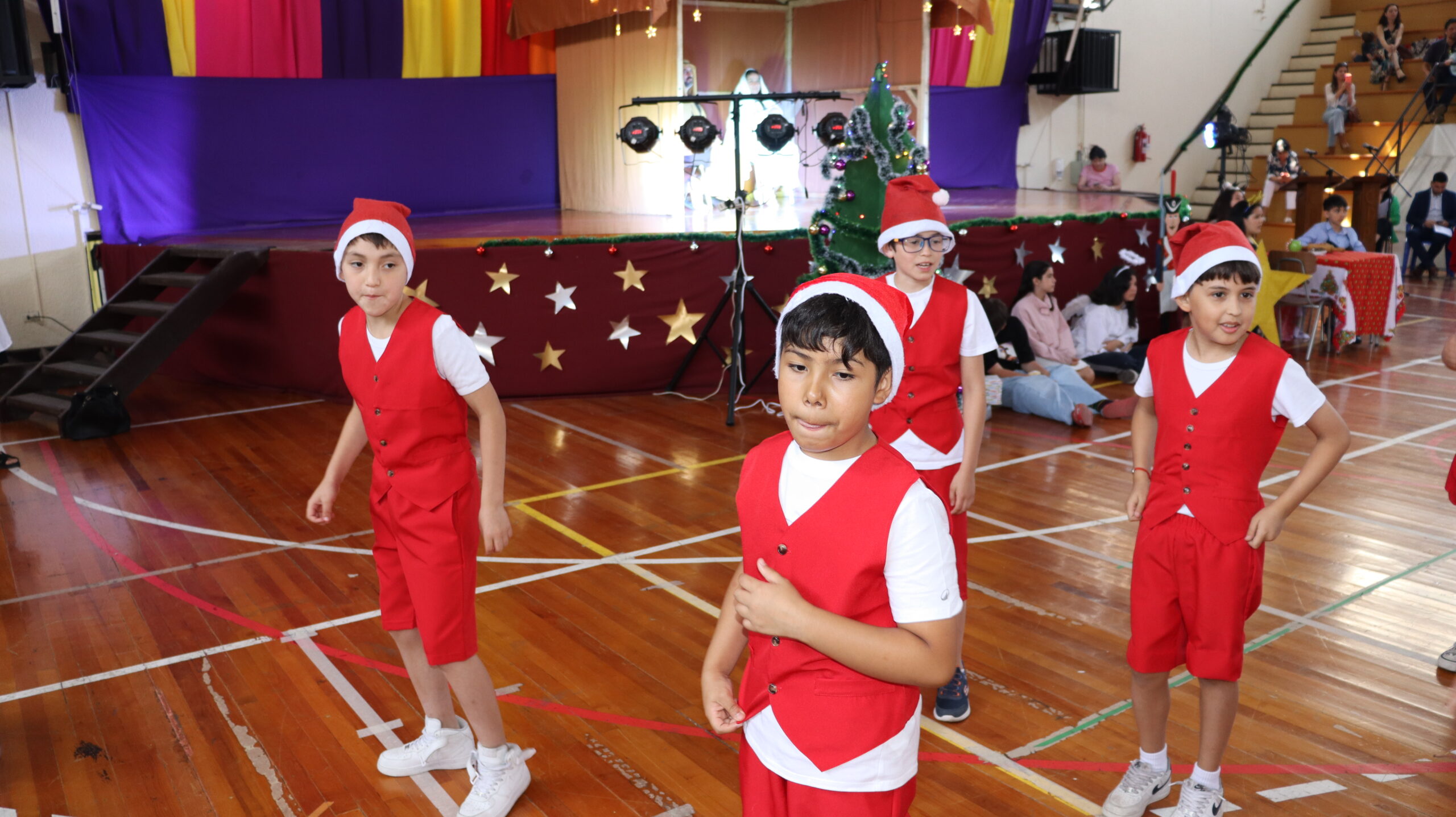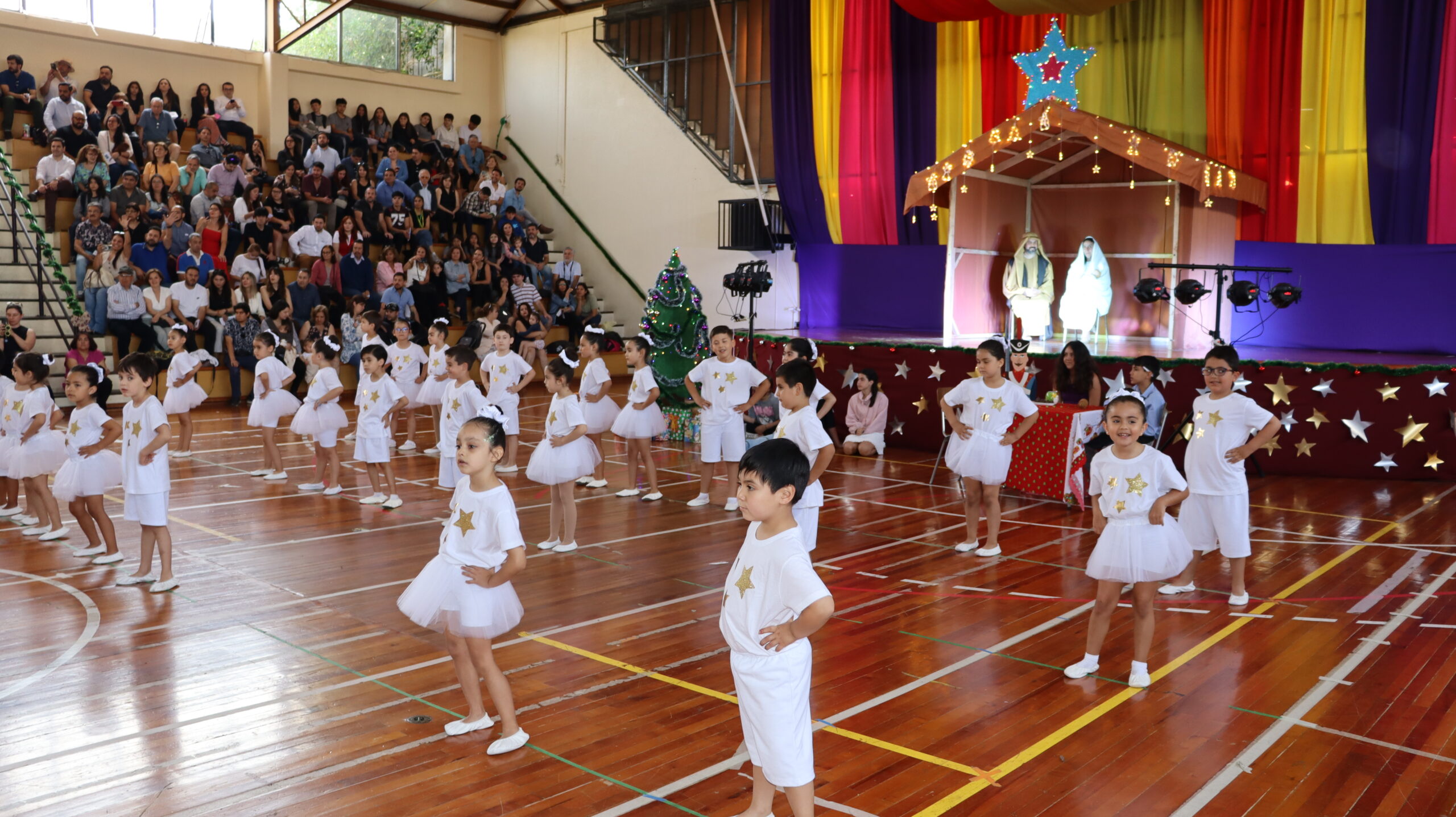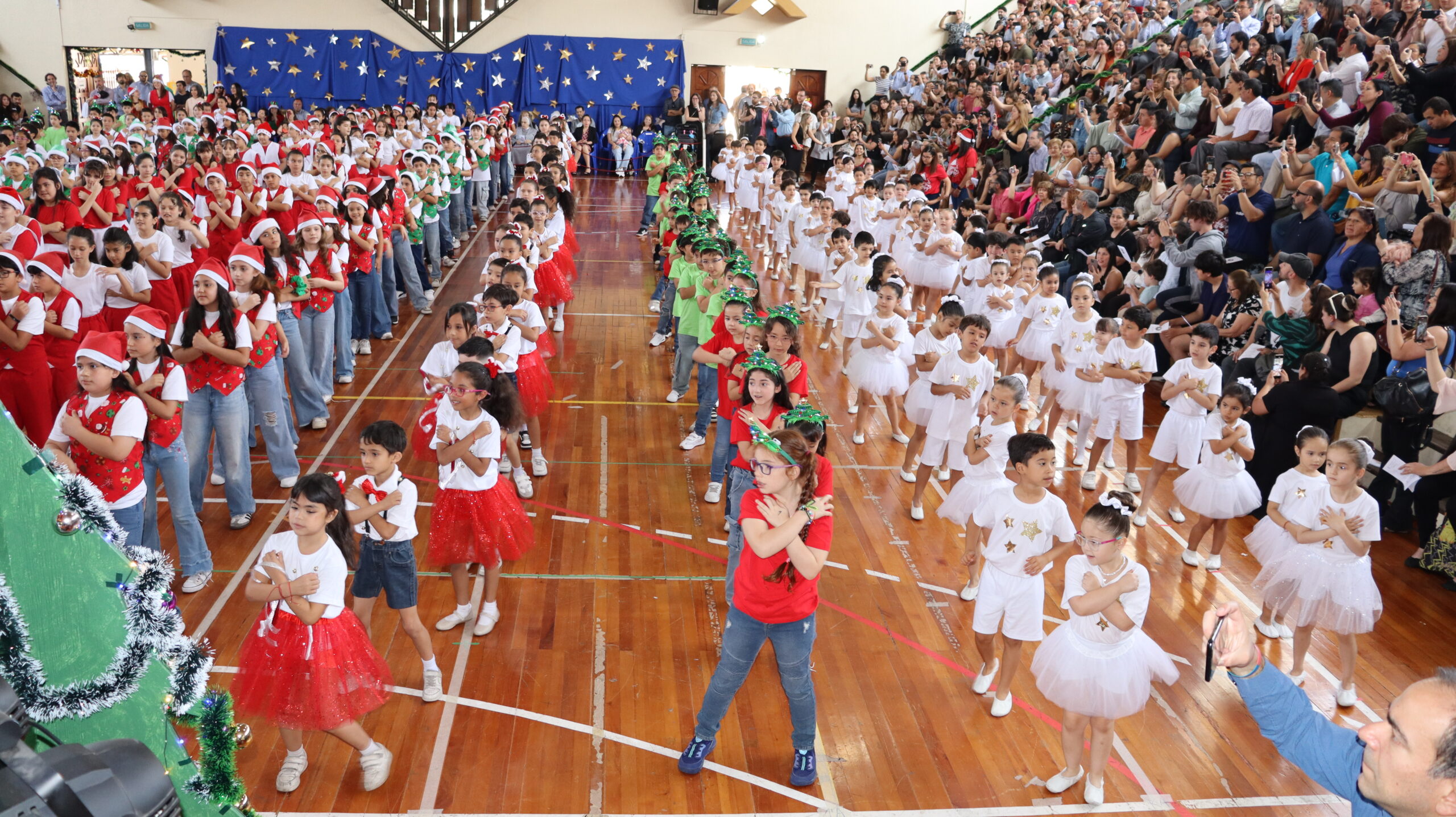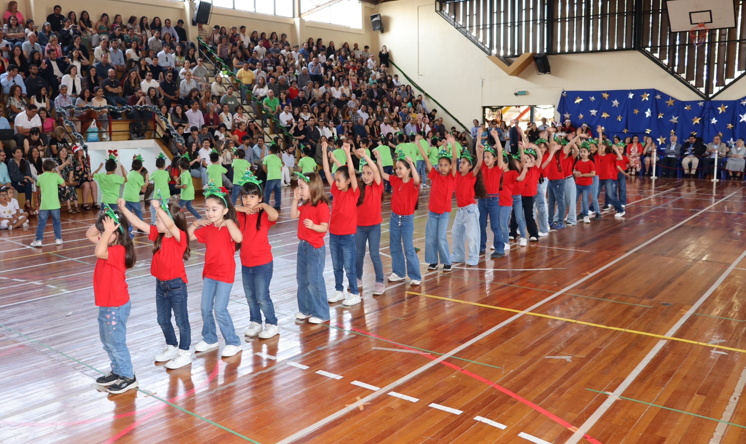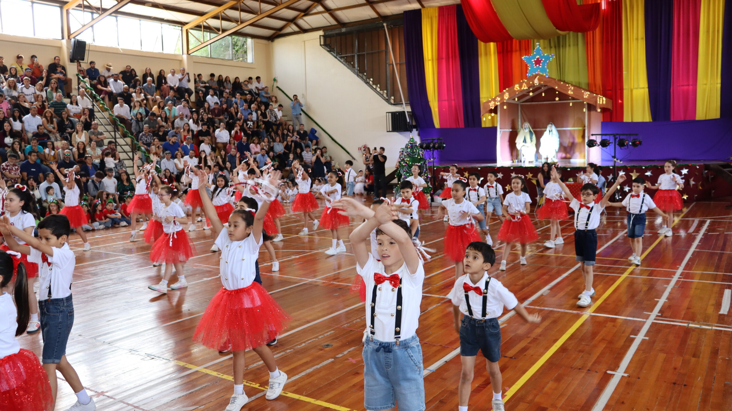 Se presentó la historia llamada “La estrella de Navidad”, donde estudiantes de 5° básico “B” representaron el cuento y apoderados de los cursos que participan en el acto formaron el pesebre humano. Los estudiantes de PK a 4° básicos bailaron diferentes cantos de Navidad, mostrando bellas coreografías armónicas para finalizar todos juntos con la canción “Ya llegó la Navidad.”