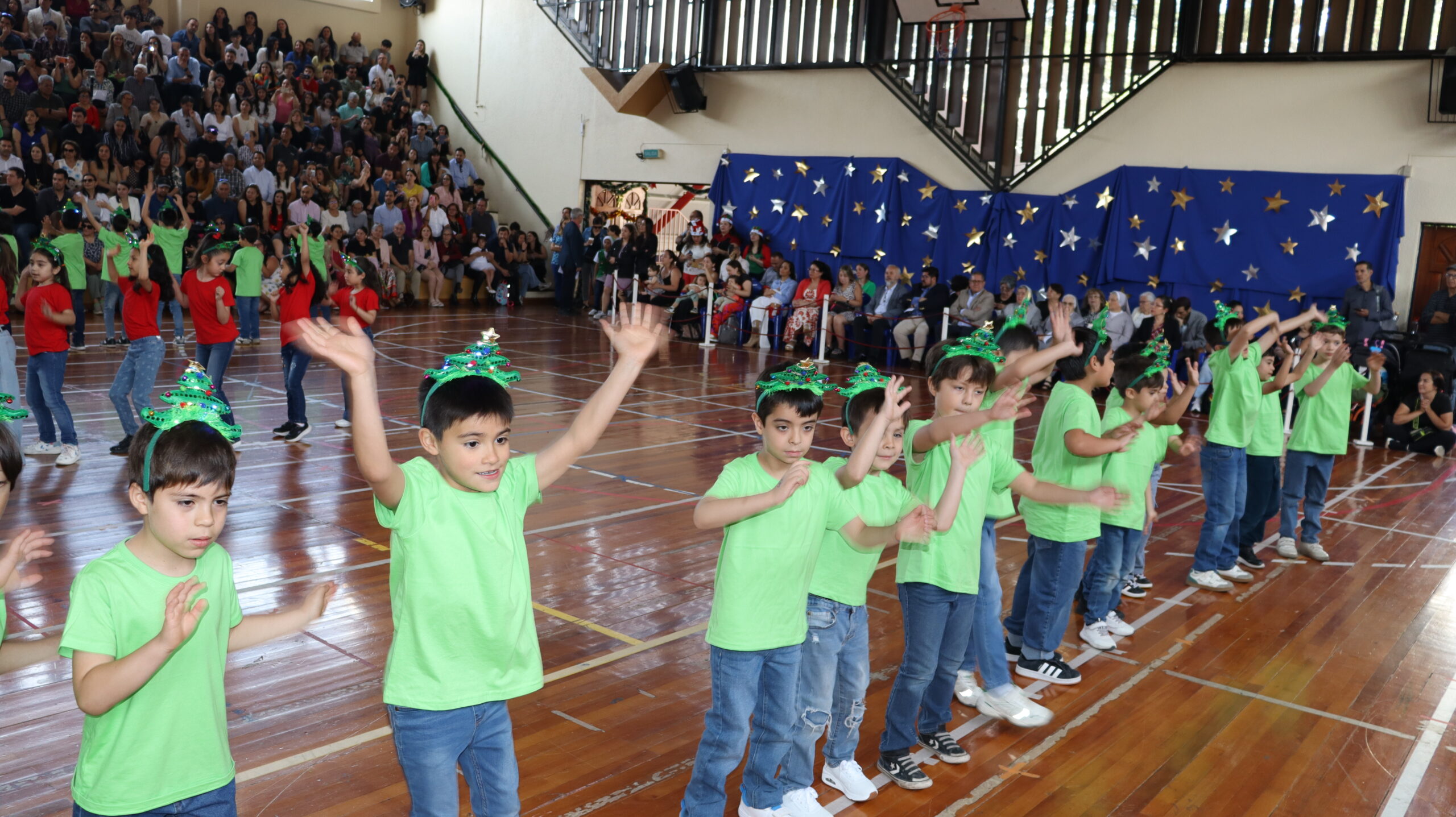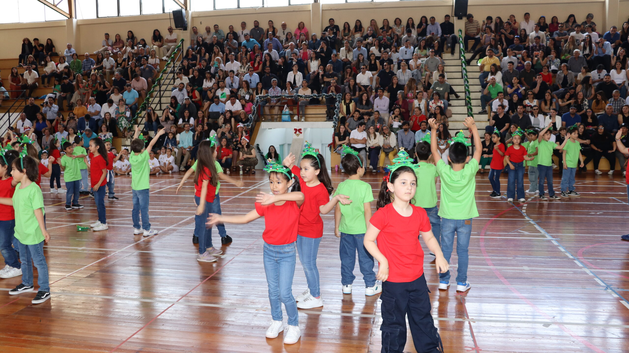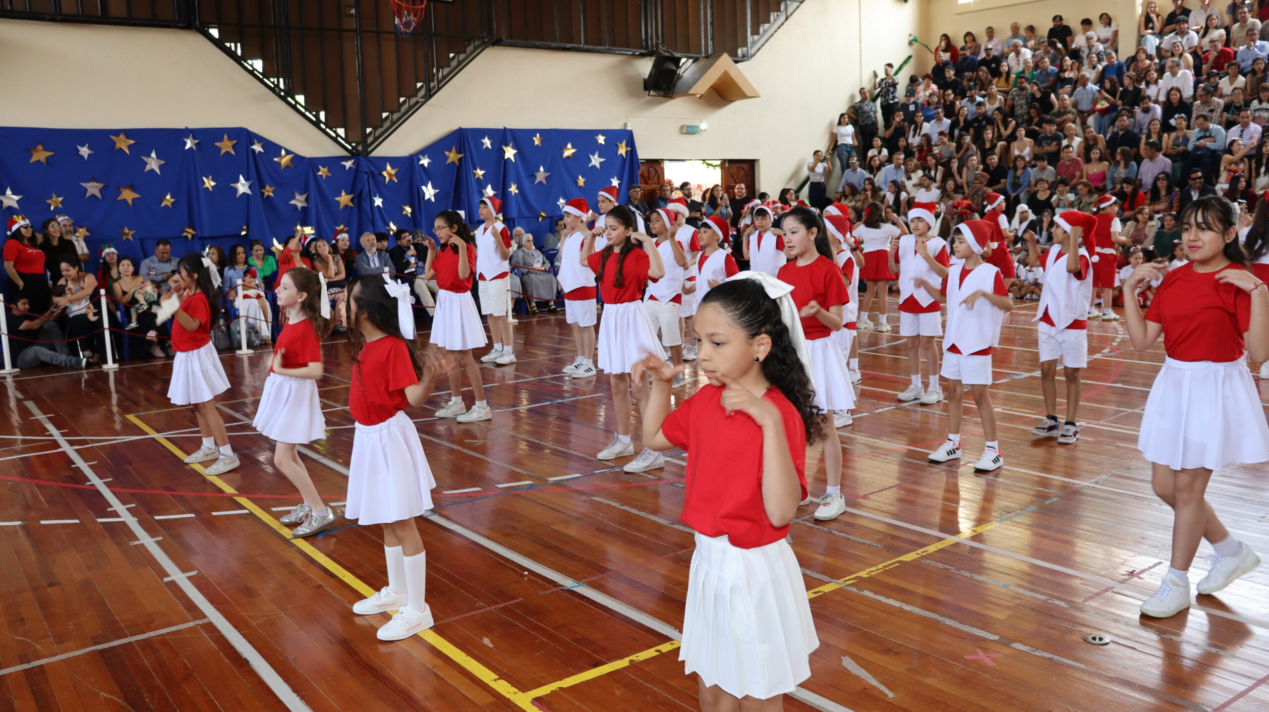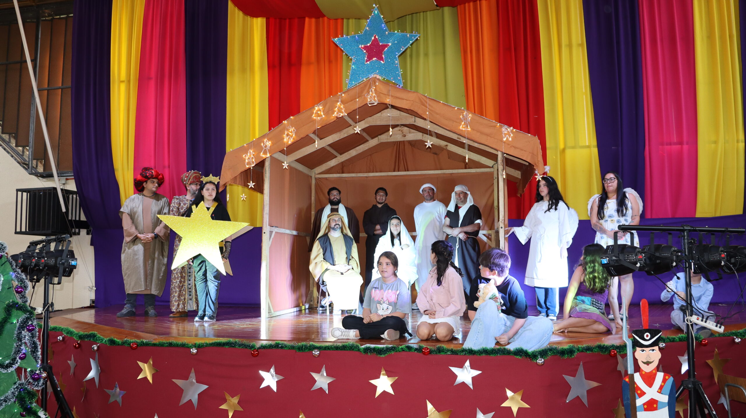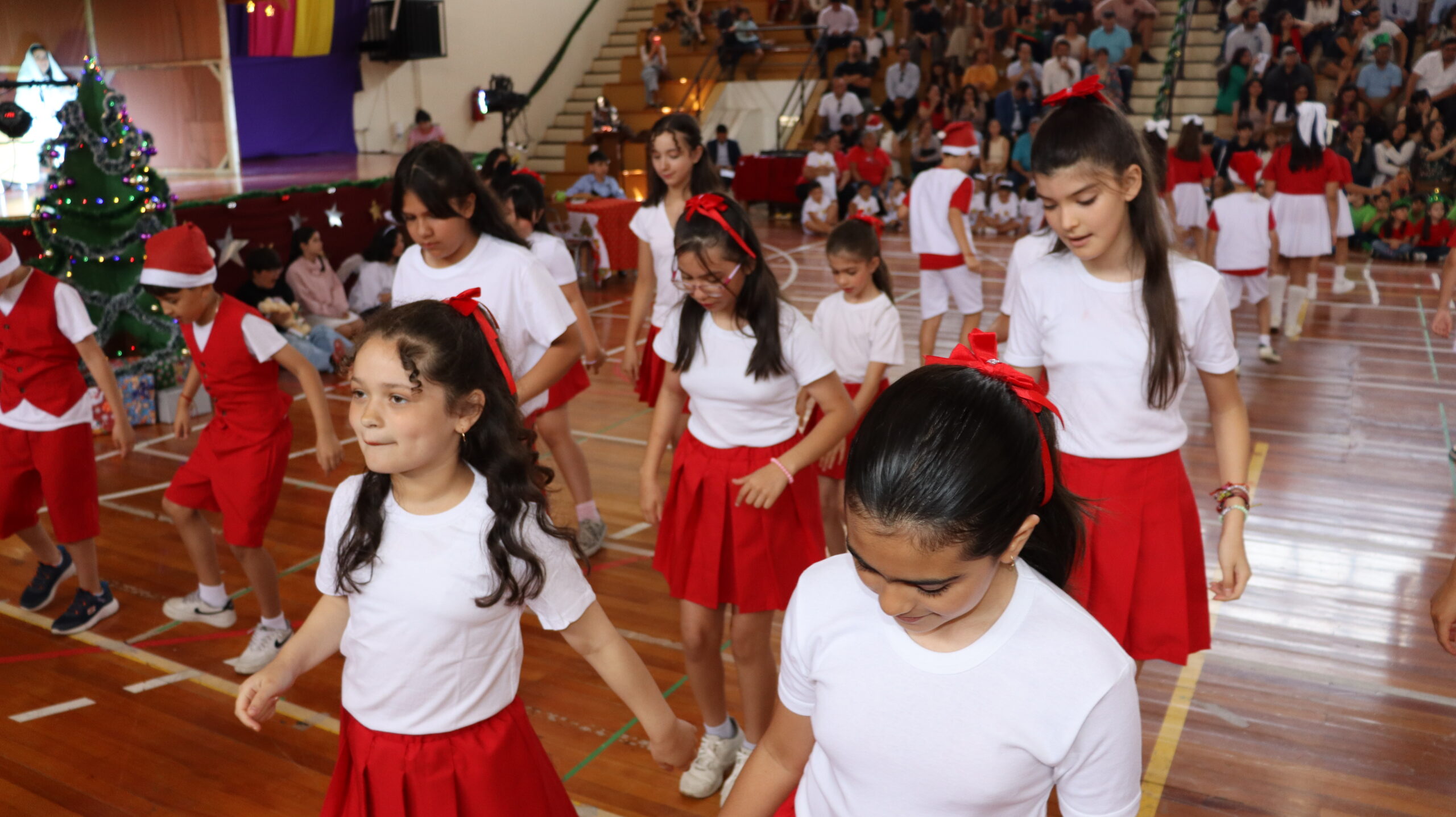 Se presentó la historia llamada “La estrella de Navidad”, donde estudiantes de 5° básico “B” representaron el cuento y apoderados de los cursos que participan en el acto formaron el pesebre humano. Los estudiantes de PK a 4° básicos bailaron diferentes cantos de Navidad, mostrando bellas coreografías armónicas para finalizar todos juntos con la canción “Ya llegó la Navidad.”