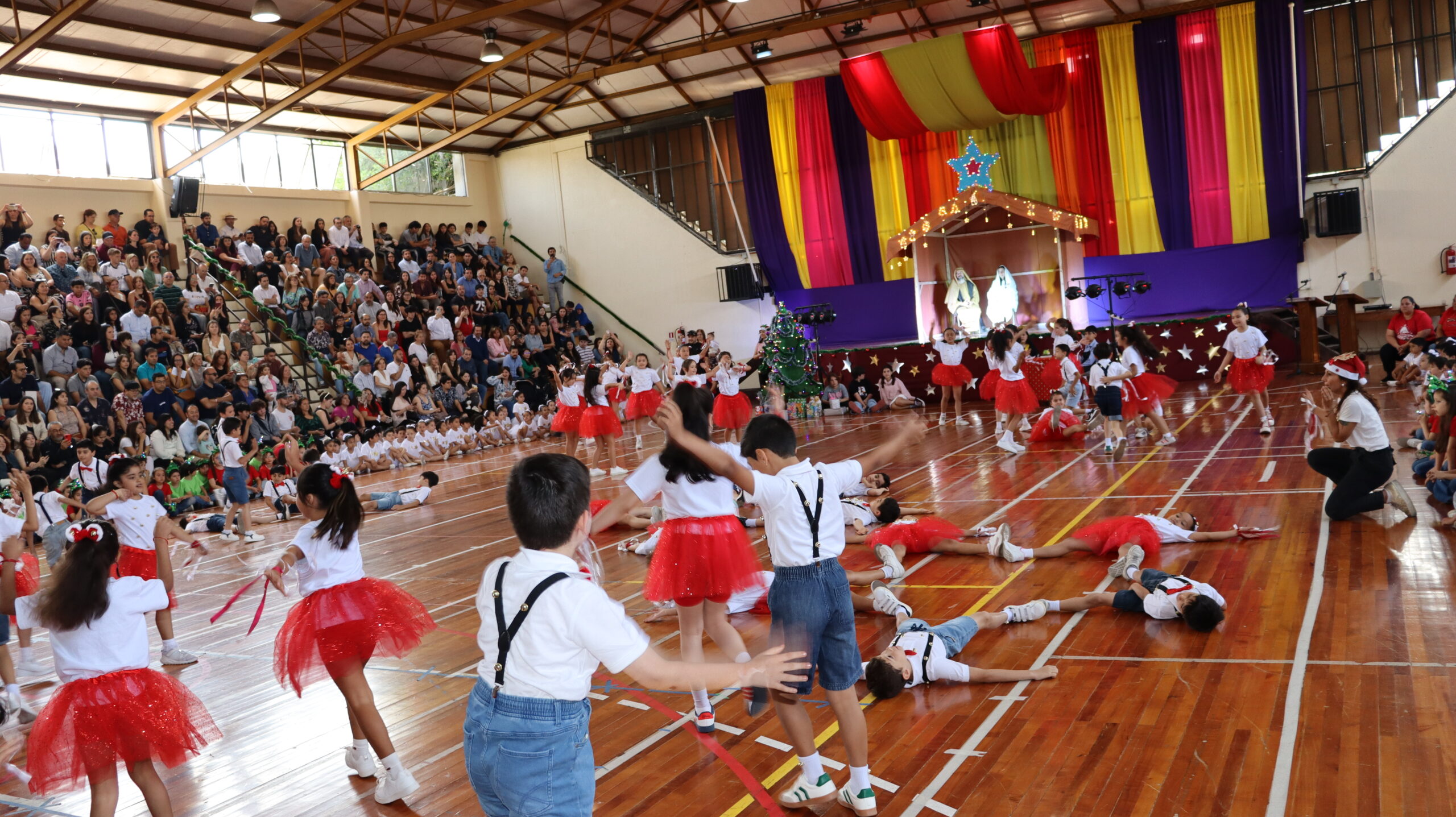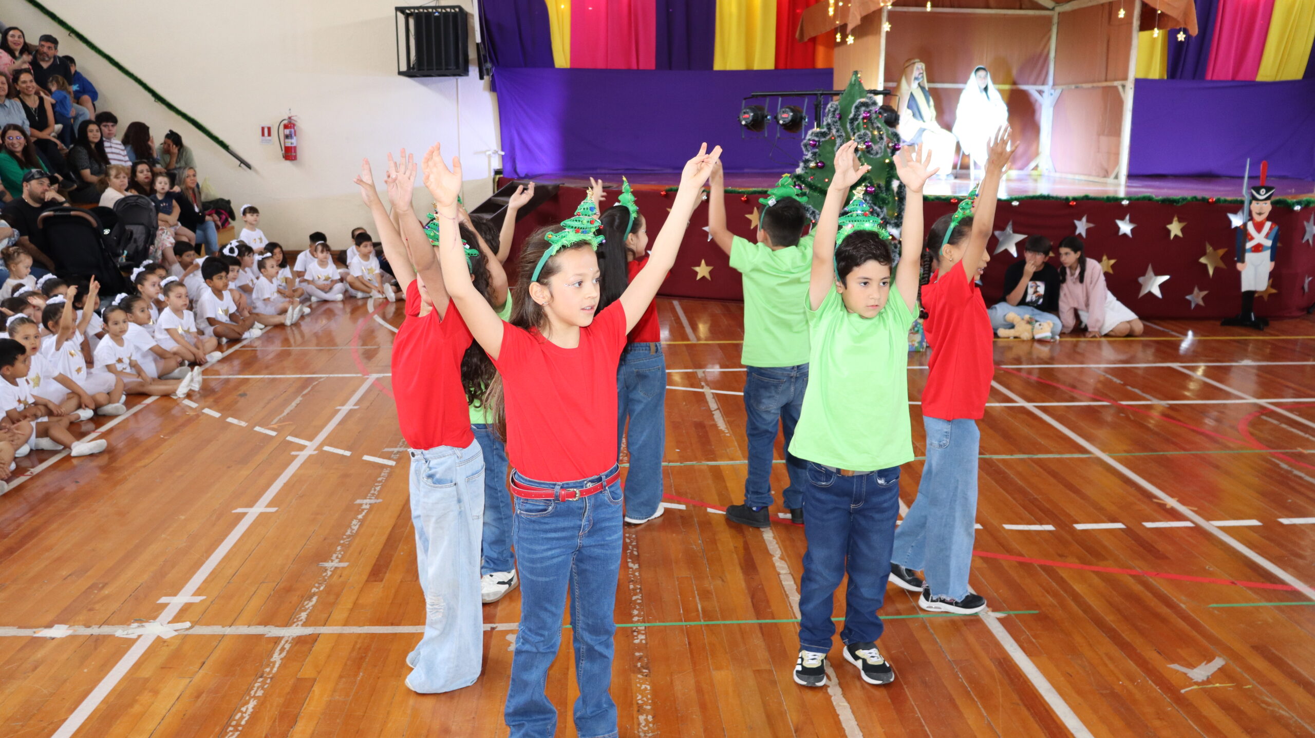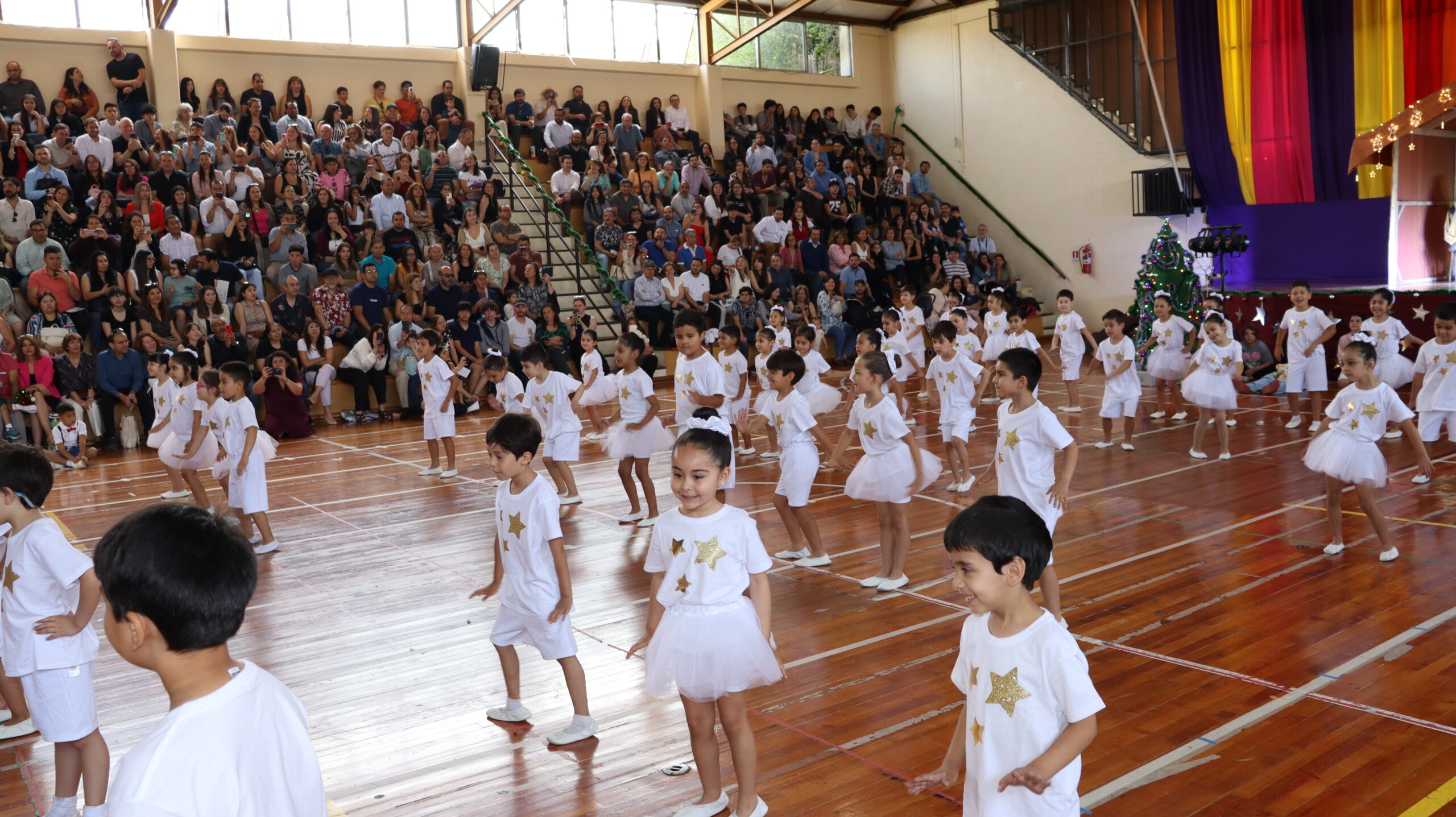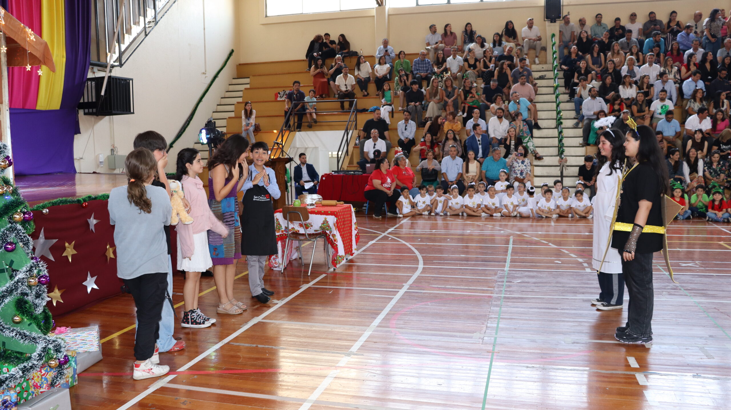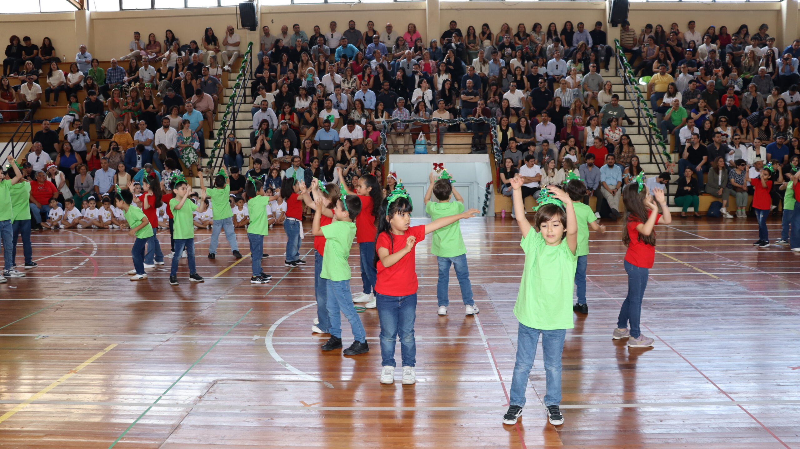 Se presentó la historia llamada “La estrella de Navidad”, donde estudiantes de 5° básico “B” representaron el cuento y apoderados de los cursos que participan en el acto formaron el pesebre humano. Los estudiantes de PK a 4° básicos bailaron diferentes cantos de Navidad, mostrando bellas coreografías armónicas para finalizar todos juntos con la canción “Ya llegó la Navidad.”