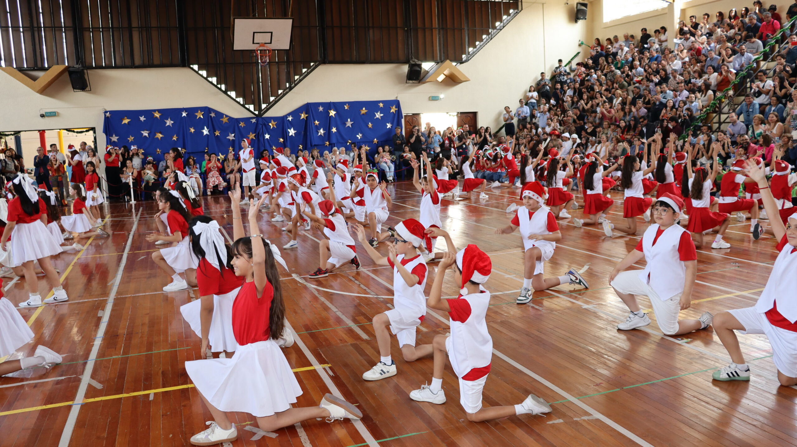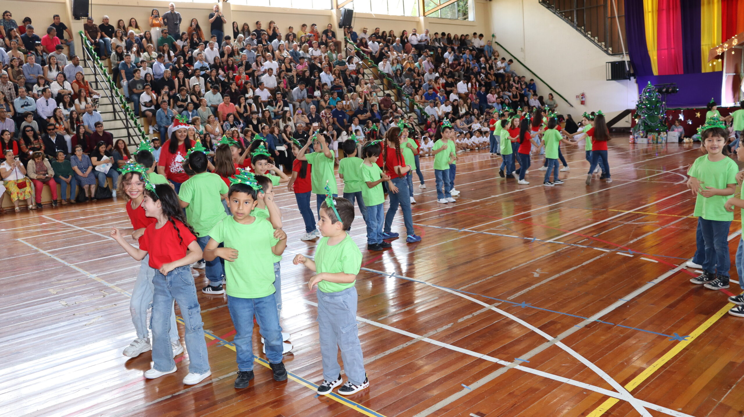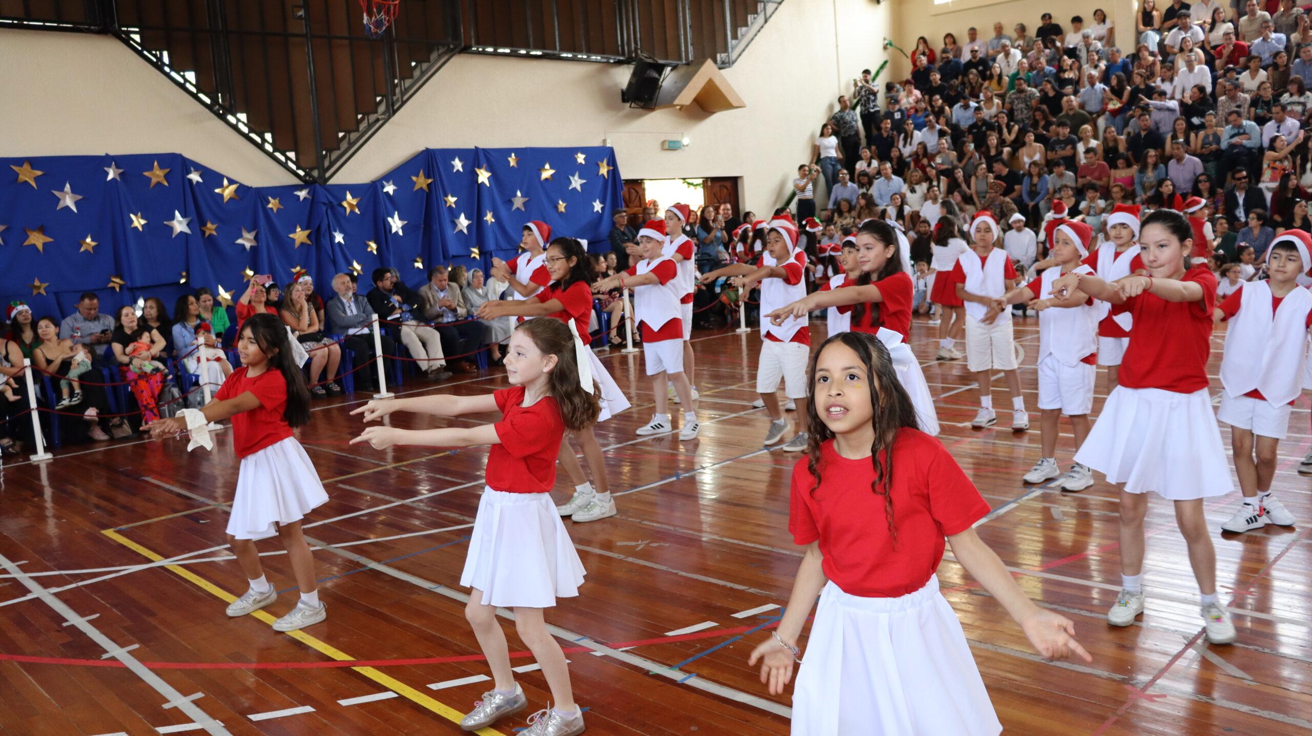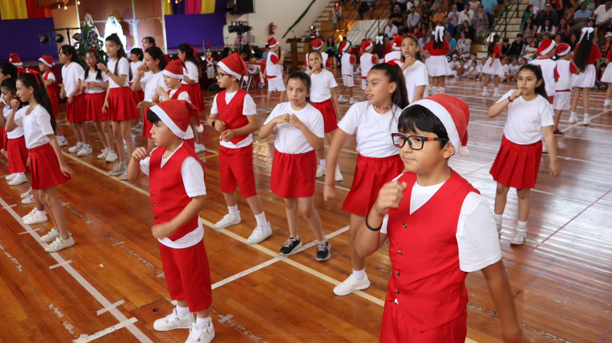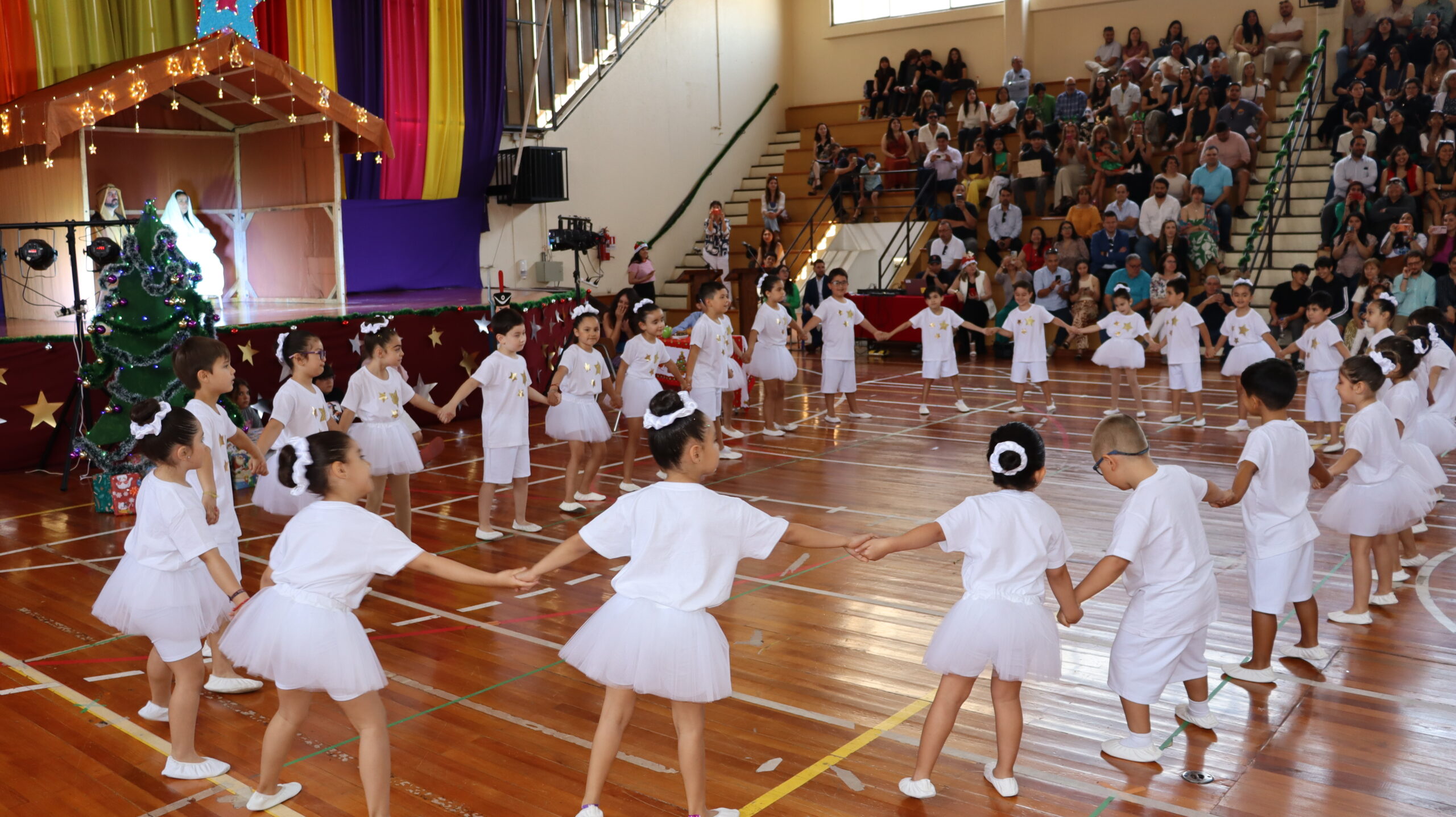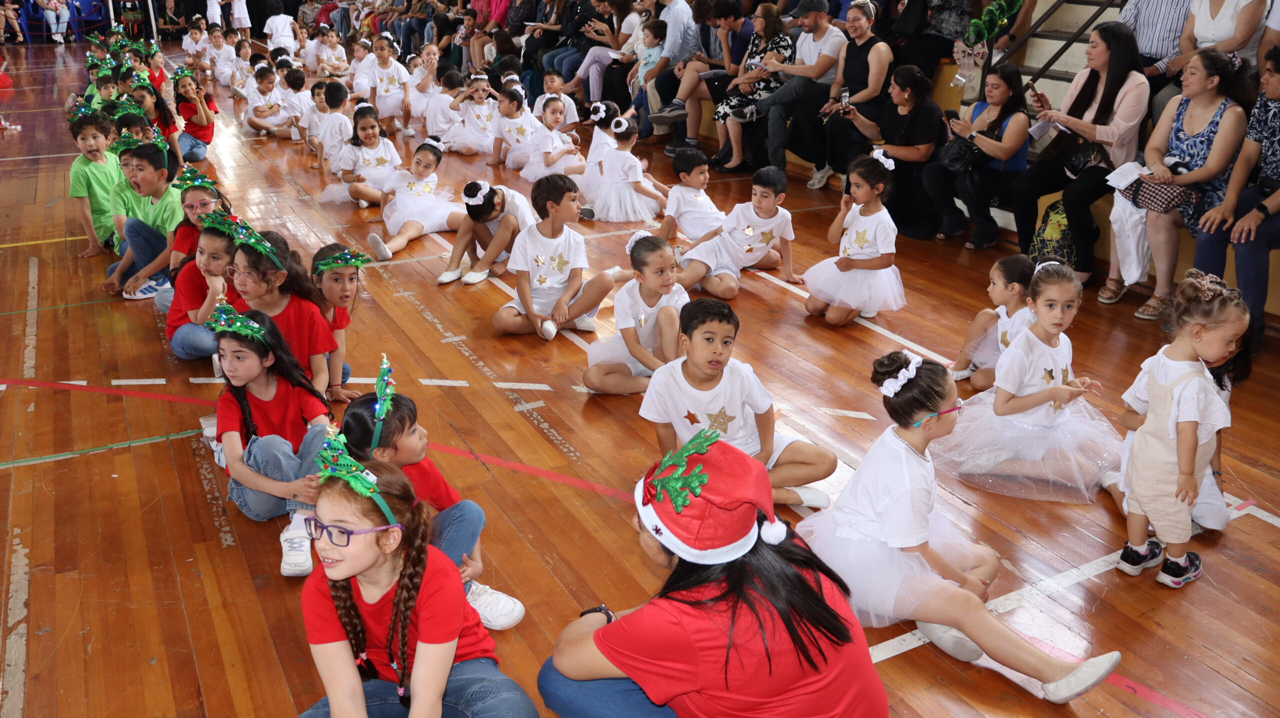 Se presentó la historia llamada “La estrella de Navidad”, donde estudiantes de 5° básico “B” representaron el cuento y apoderados de los cursos que participan en el acto formaron el pesebre humano. Los estudiantes de PK a 4° básicos bailaron diferentes cantos de Navidad, mostrando bellas coreografías armónicas para finalizar todos juntos con la canción “Ya llegó la Navidad.”