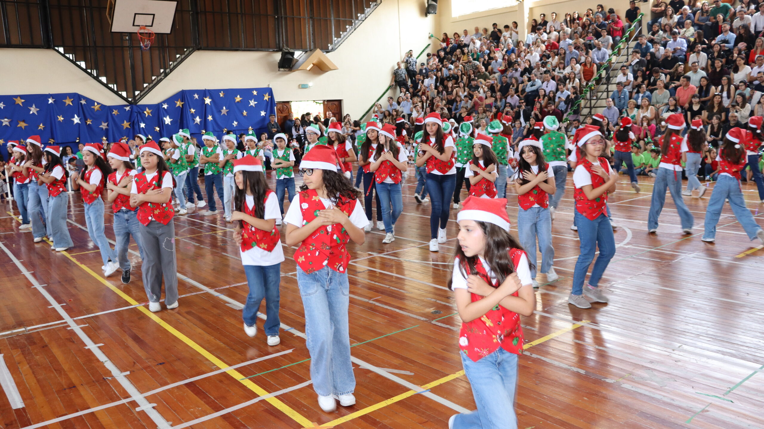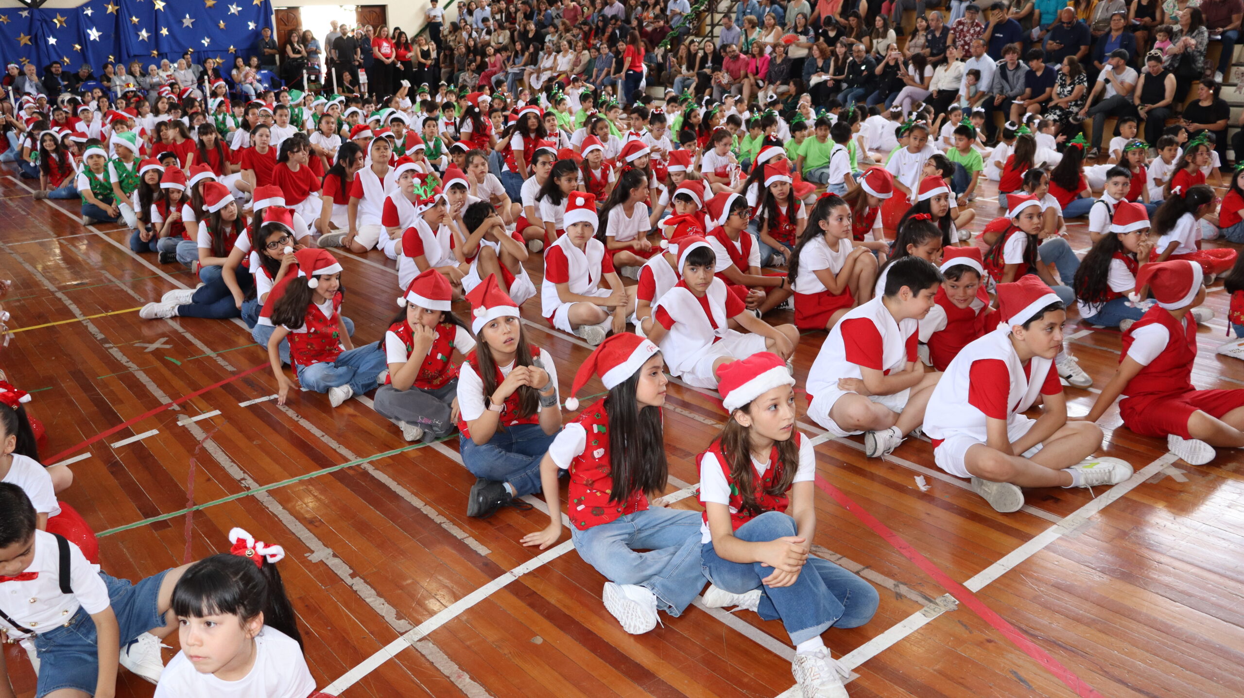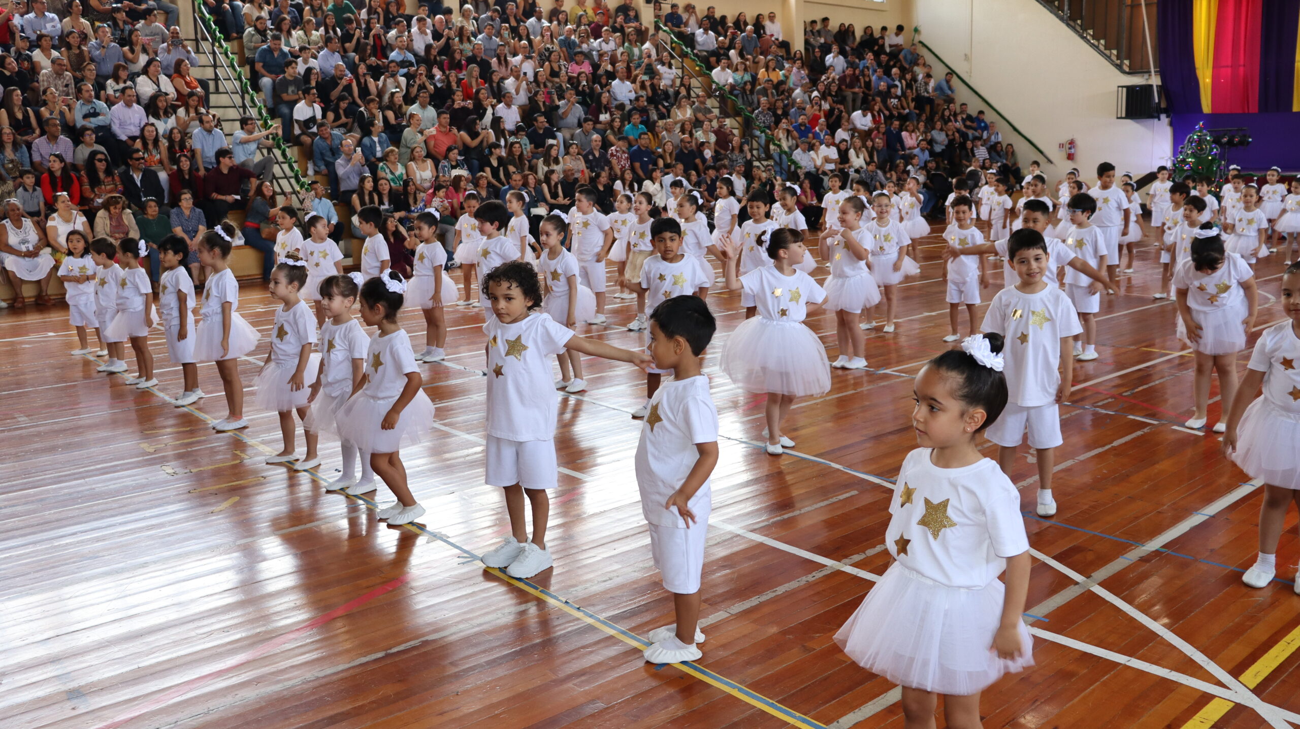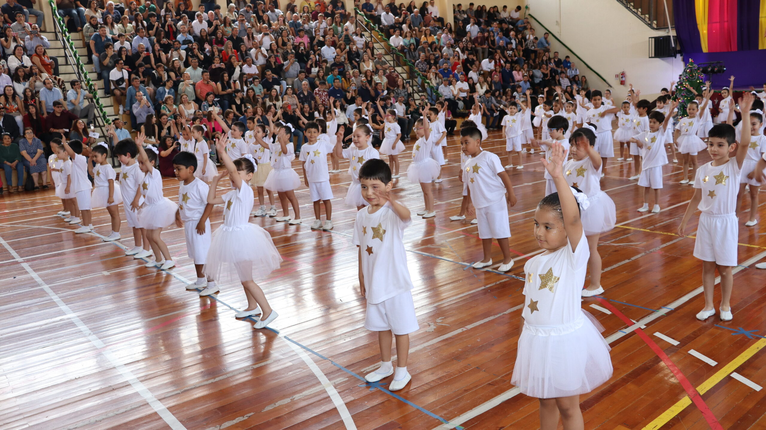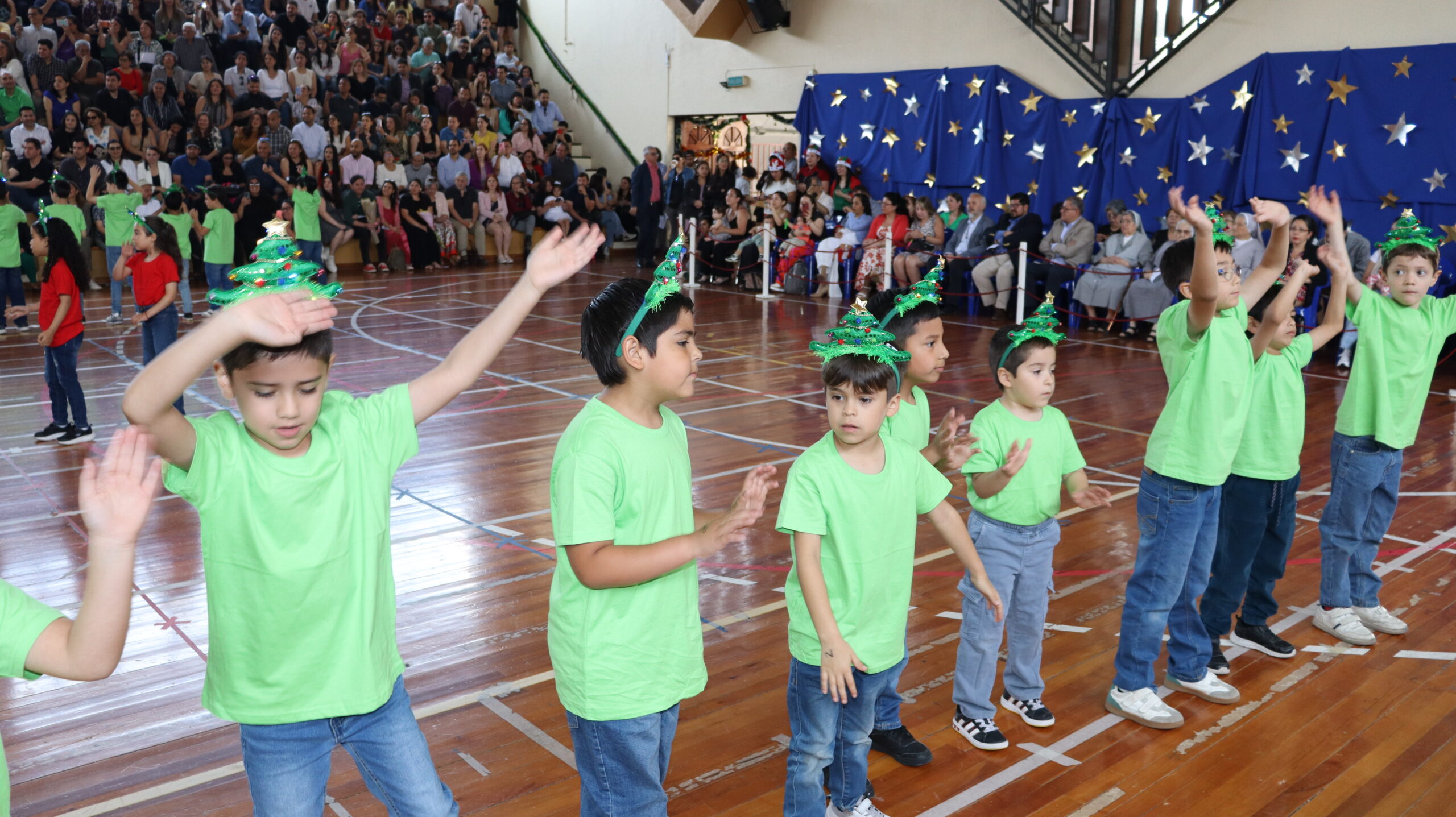 Se presentó la historia llamada “La estrella de Navidad”, donde estudiantes de 5° básico “B” representaron el cuento y apoderados de los cursos que participan en el acto formaron el pesebre humano. Los estudiantes de PK a 4° básicos bailaron diferentes cantos de Navidad, mostrando bellas coreografías armónicas para finalizar todos juntos con la canción “Ya llegó la Navidad.”