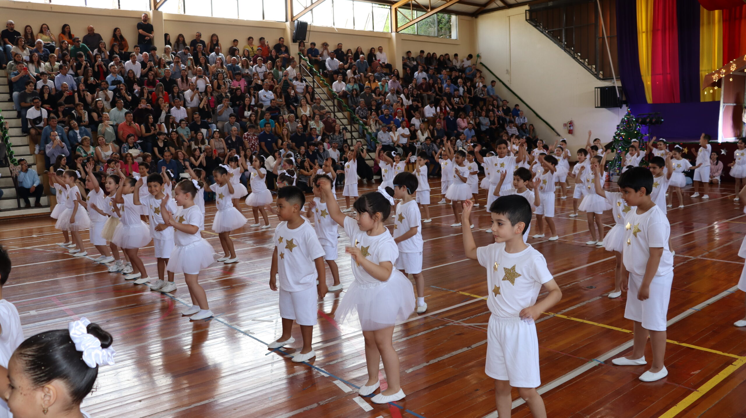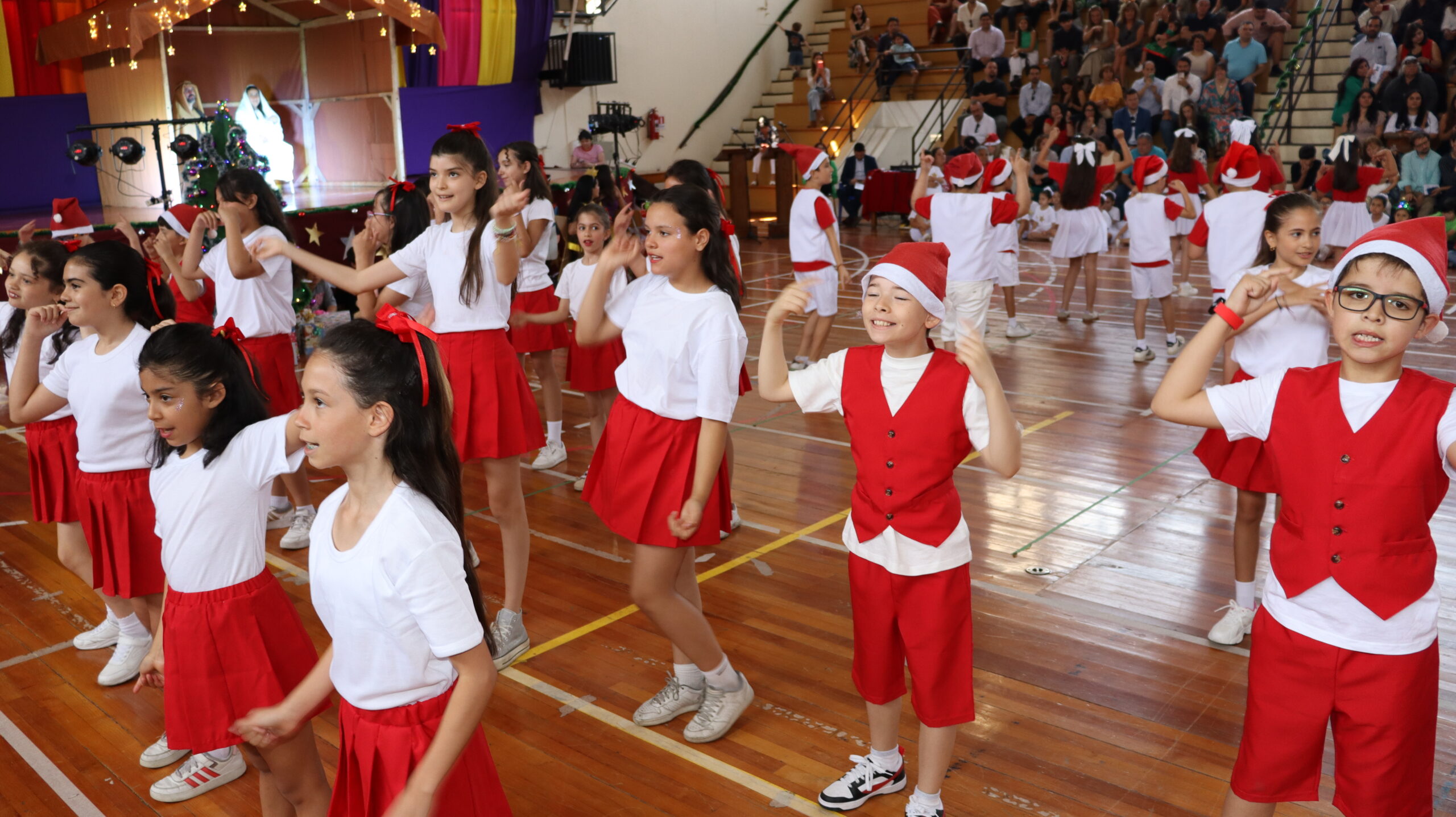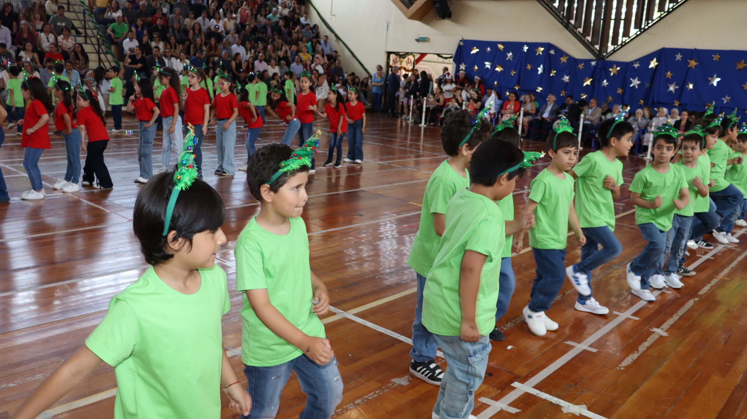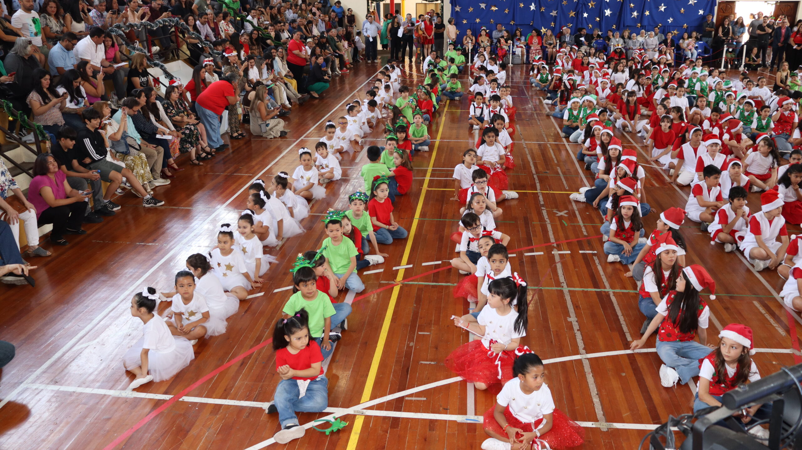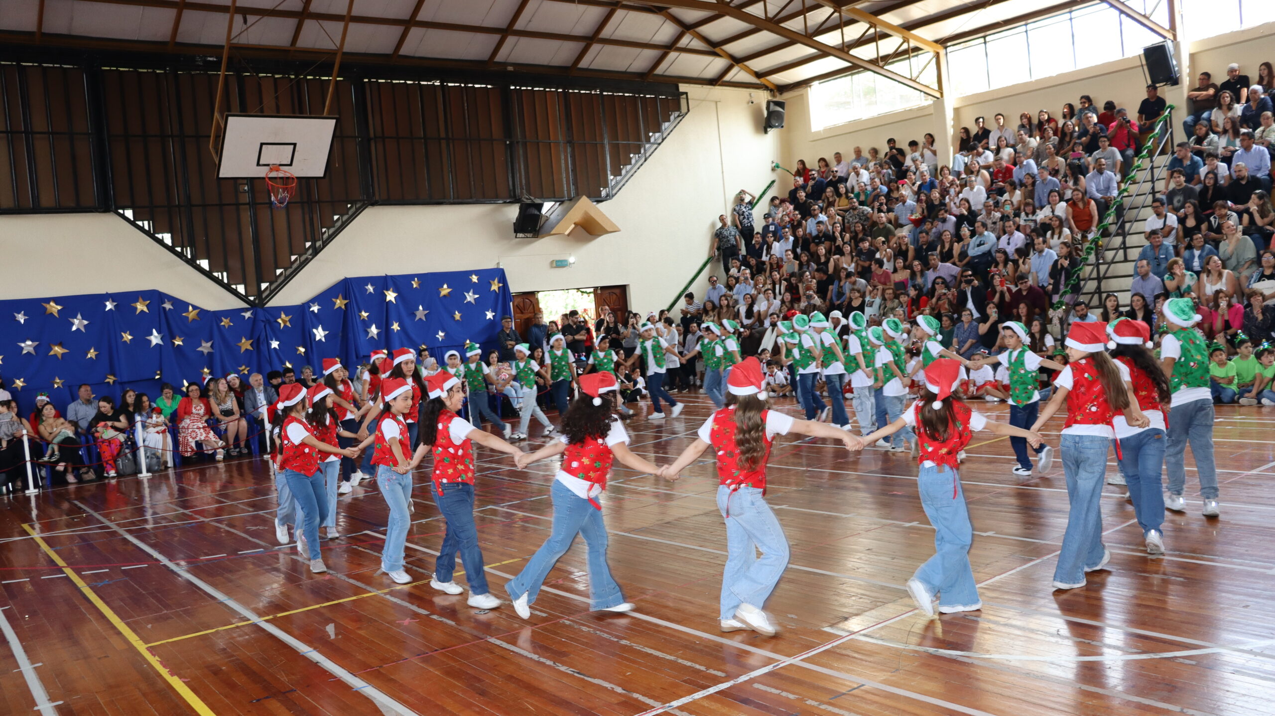 Se presentó la historia llamada “La estrella de Navidad”, donde estudiantes de 5° básico “B” representaron el cuento y apoderados de los cursos que participan en el acto formaron el pesebre humano. Los estudiantes de PK a 4° básicos bailaron diferentes cantos de Navidad, mostrando bellas coreografías armónicas para finalizar todos juntos con la canción “Ya llegó la Navidad.”