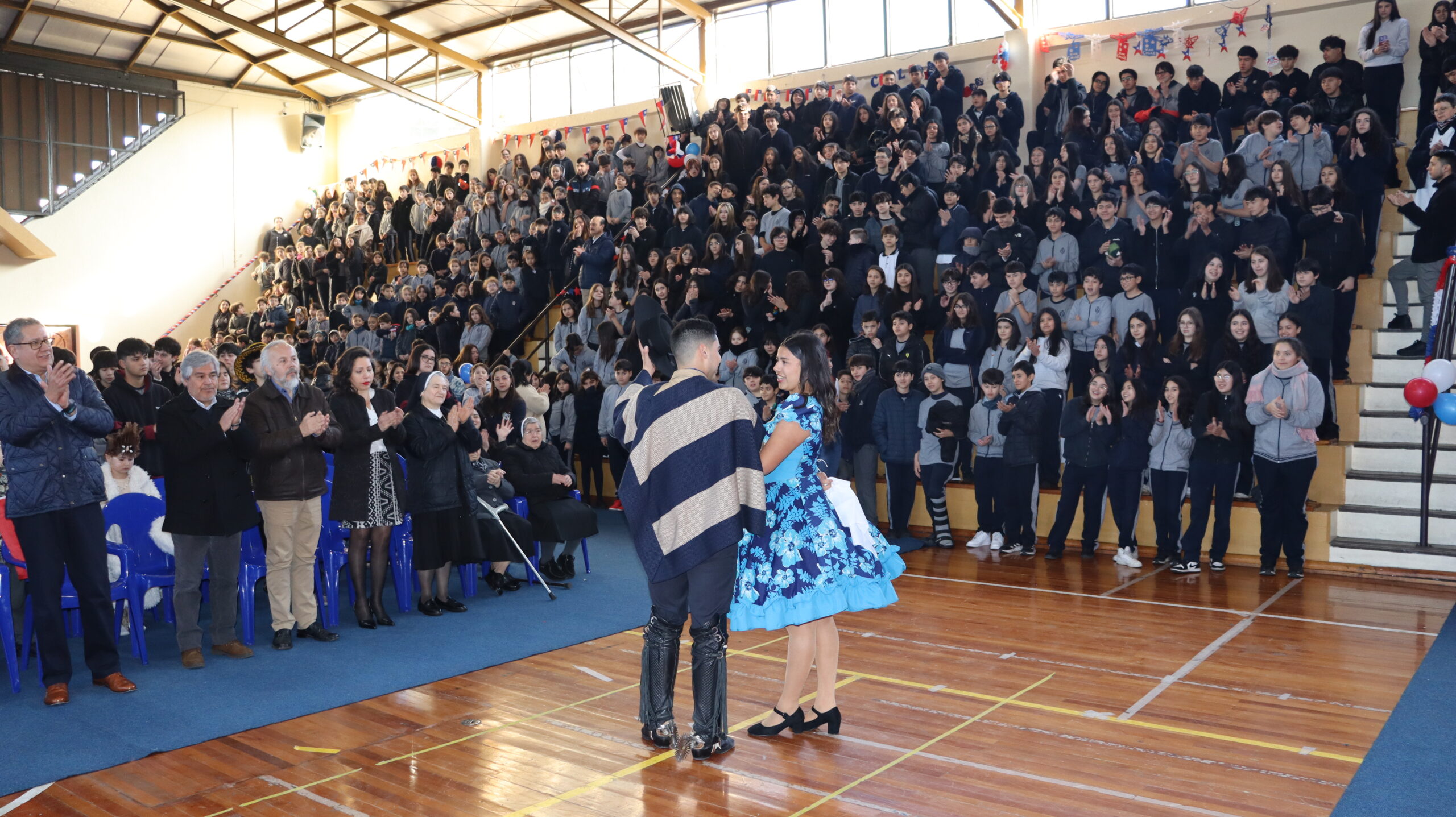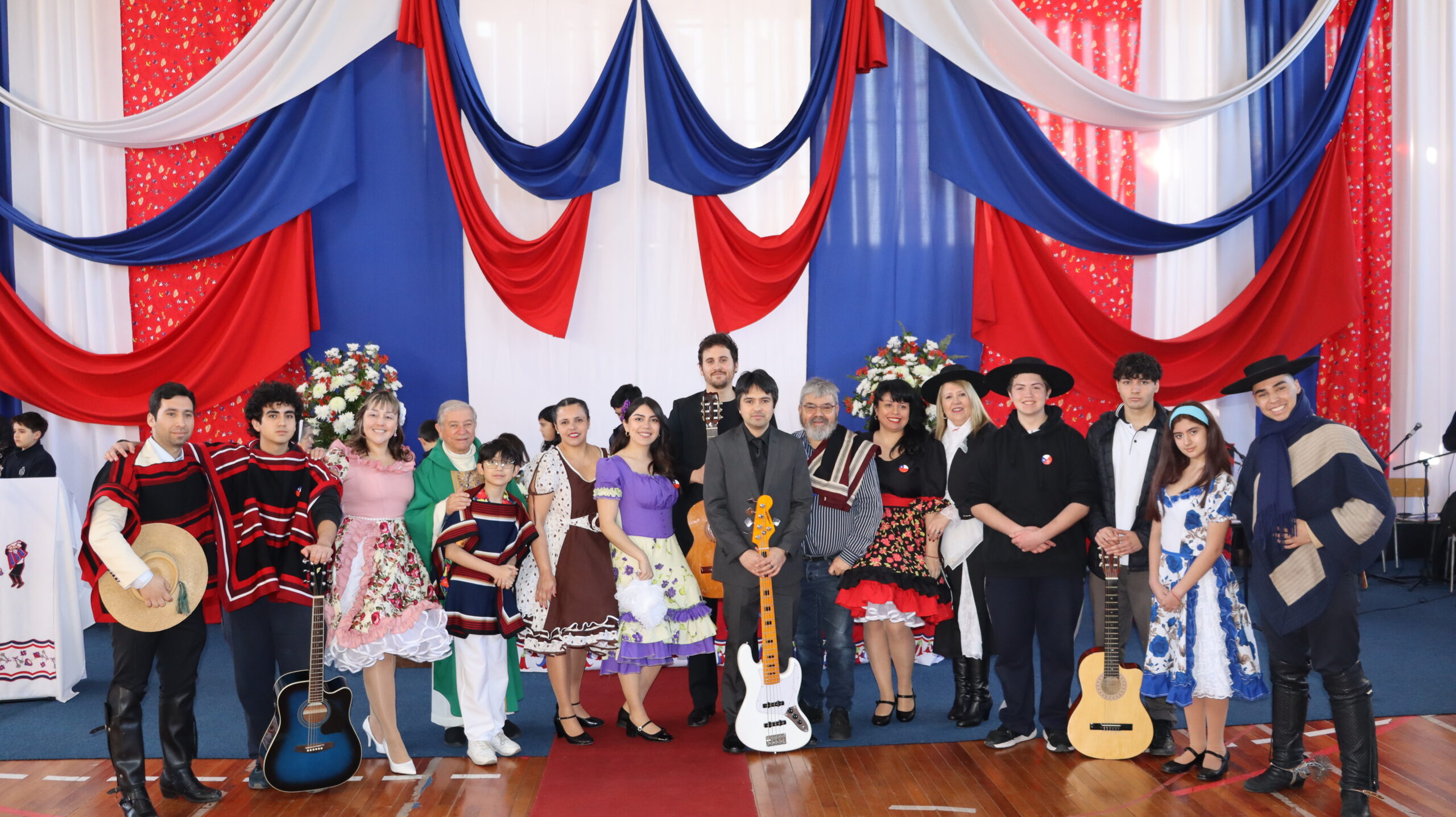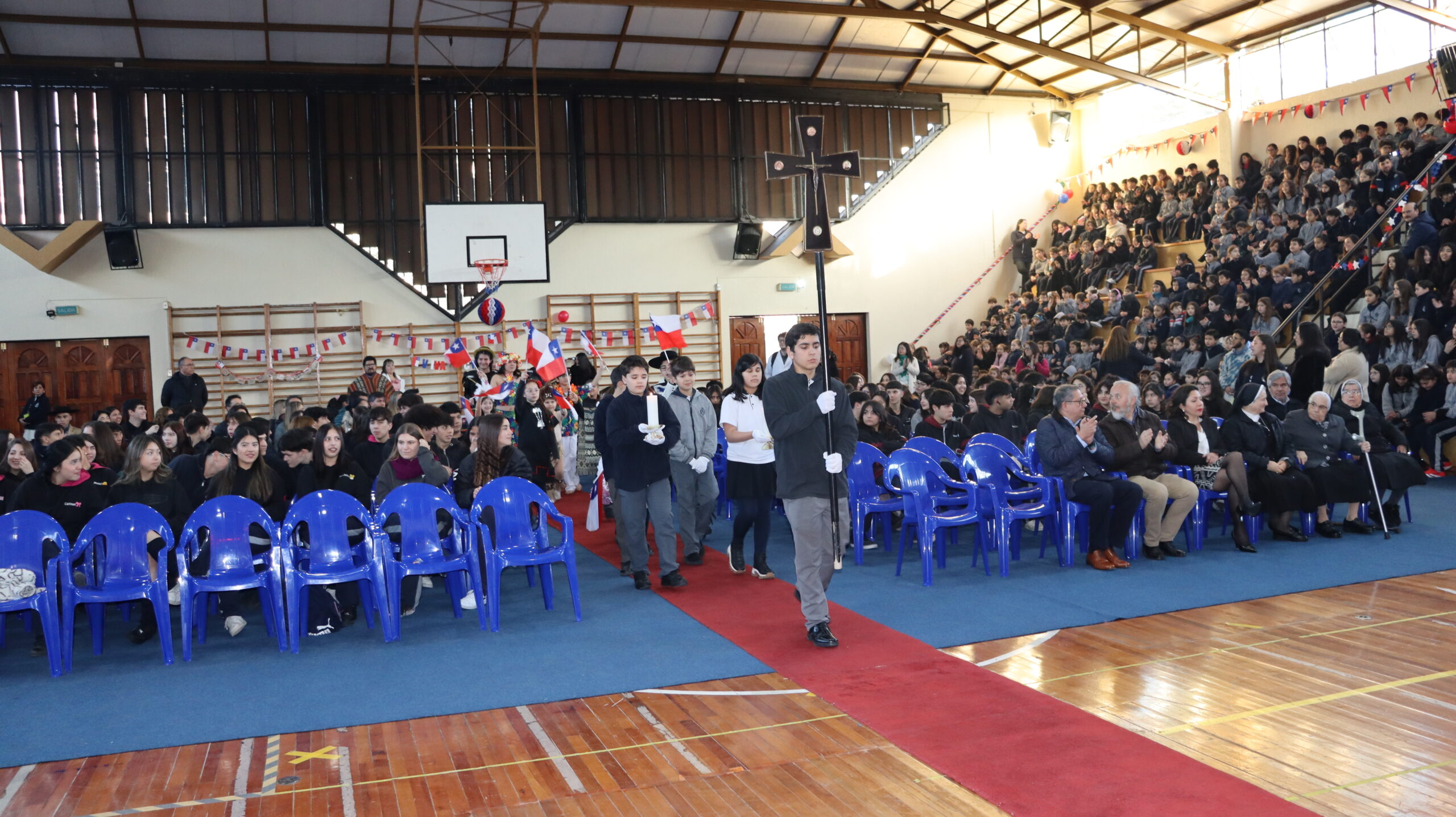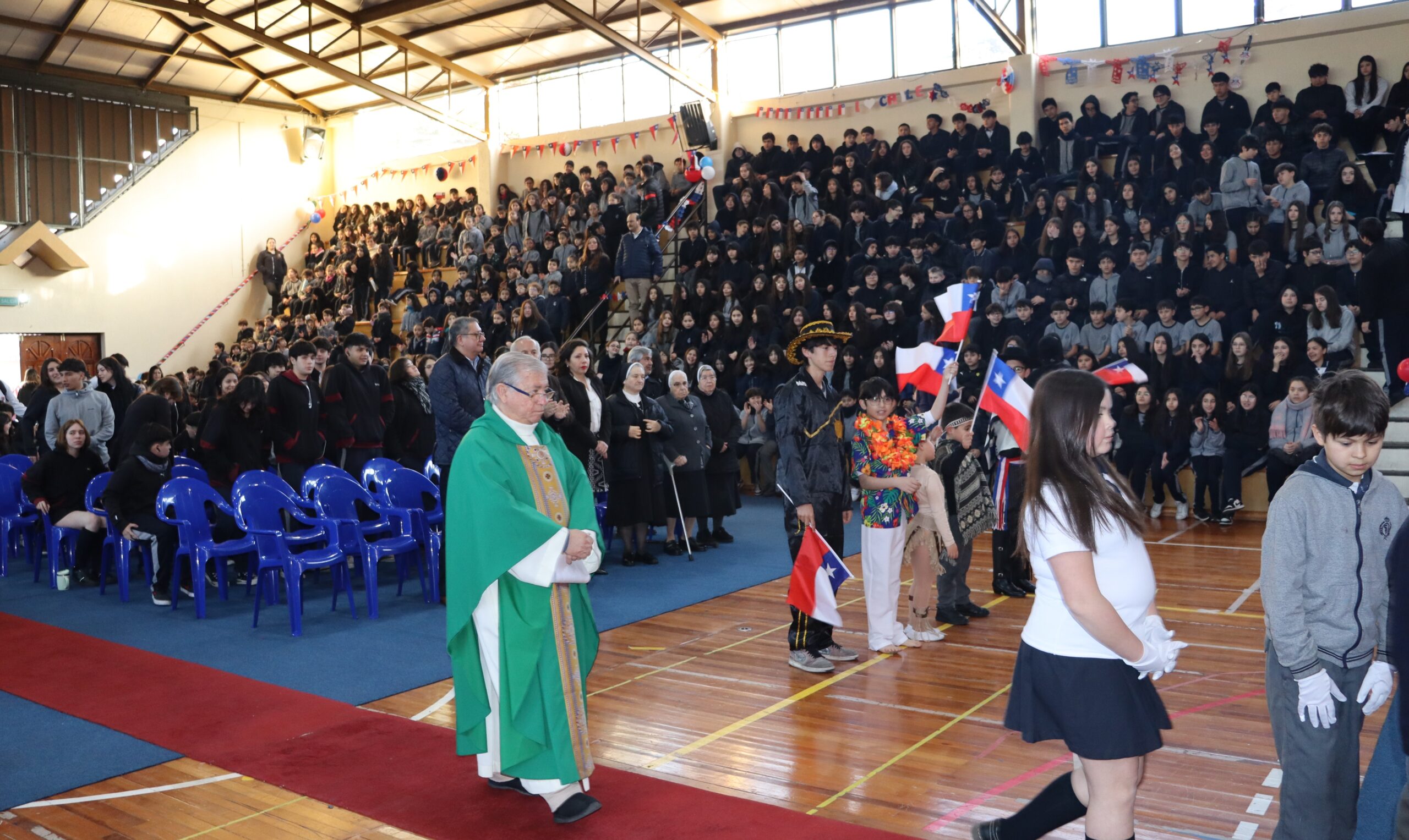 Toda la comunidad educativa: estudiantes, docentes, directivos, comunidad religiosa, padres, apoderados y personal del colegio, nos reunimos para dar gracias a Dios por nuestra patria. La participación de todos, con sus trajes típicos, sus pañuelos al viento y sus voces entonando cantos a la chilena, hizo de esta celebración un verdadero testimonio de fe y de amor por nuestras raíces.